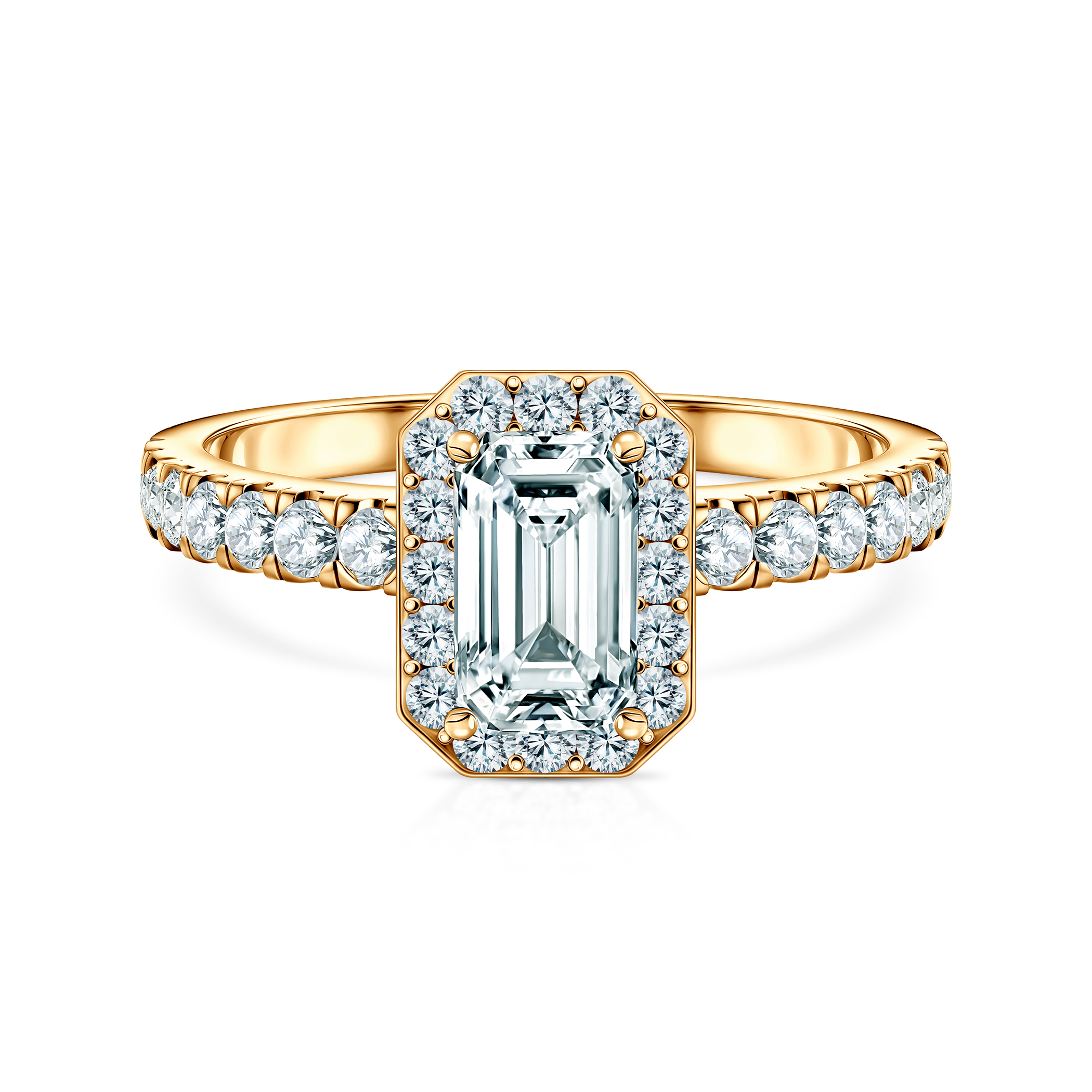 Pierścionek zaręczynowy z centralnie umieszczonym diamentem o masie 0,5 ct wysokiej czystości SI2/H, o szlifie szmaragdowym. Wykonany z 14-karatowego żółtego złota (próba 0,585).