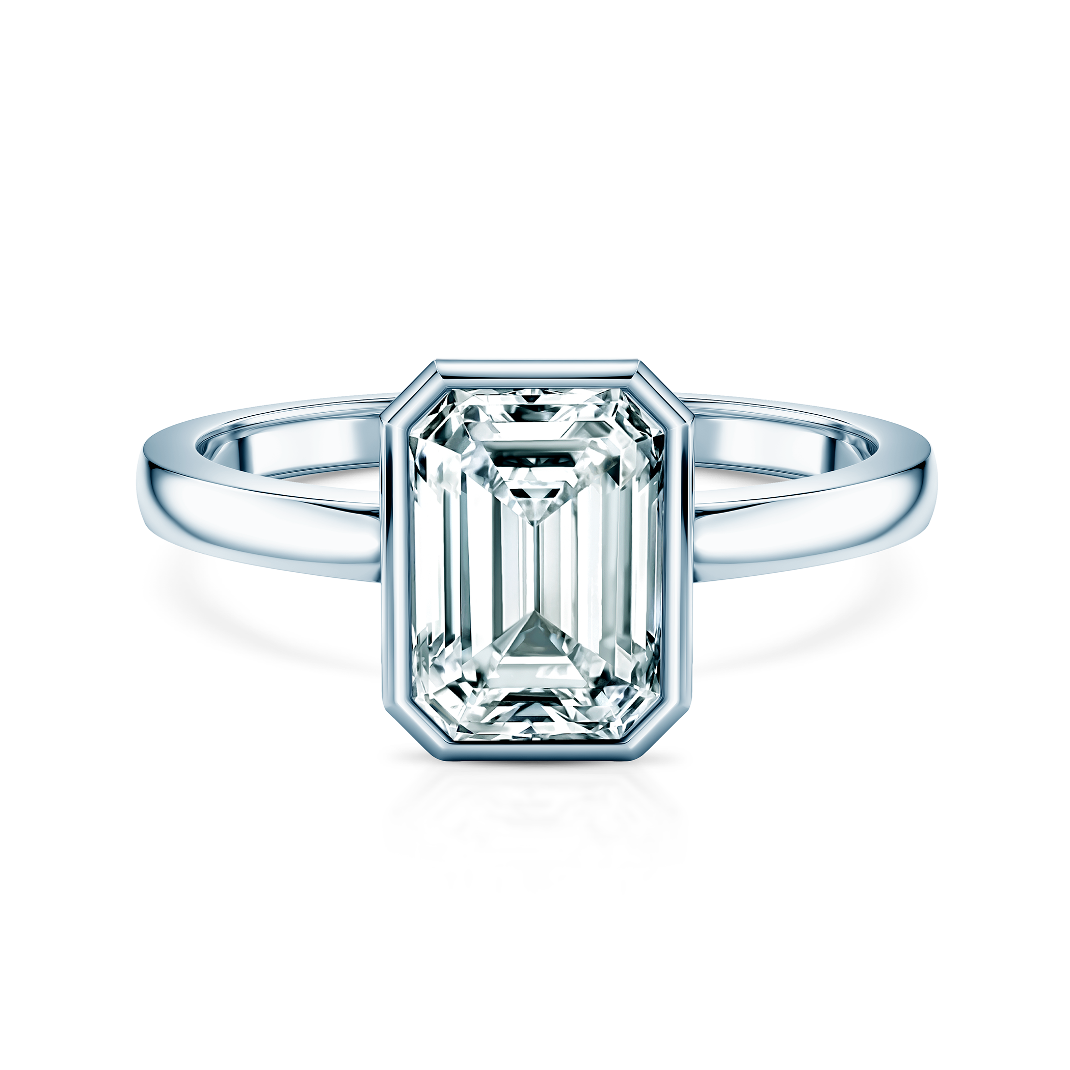 Pierścionek zaręczynowy z centralnie umieszczonym diamentem o masie 1,00 ct wysokiej czystości VS2/G, o szlifie szmaragdowym. Wykonany z 14-karatowego białego złota (próba 0,585).