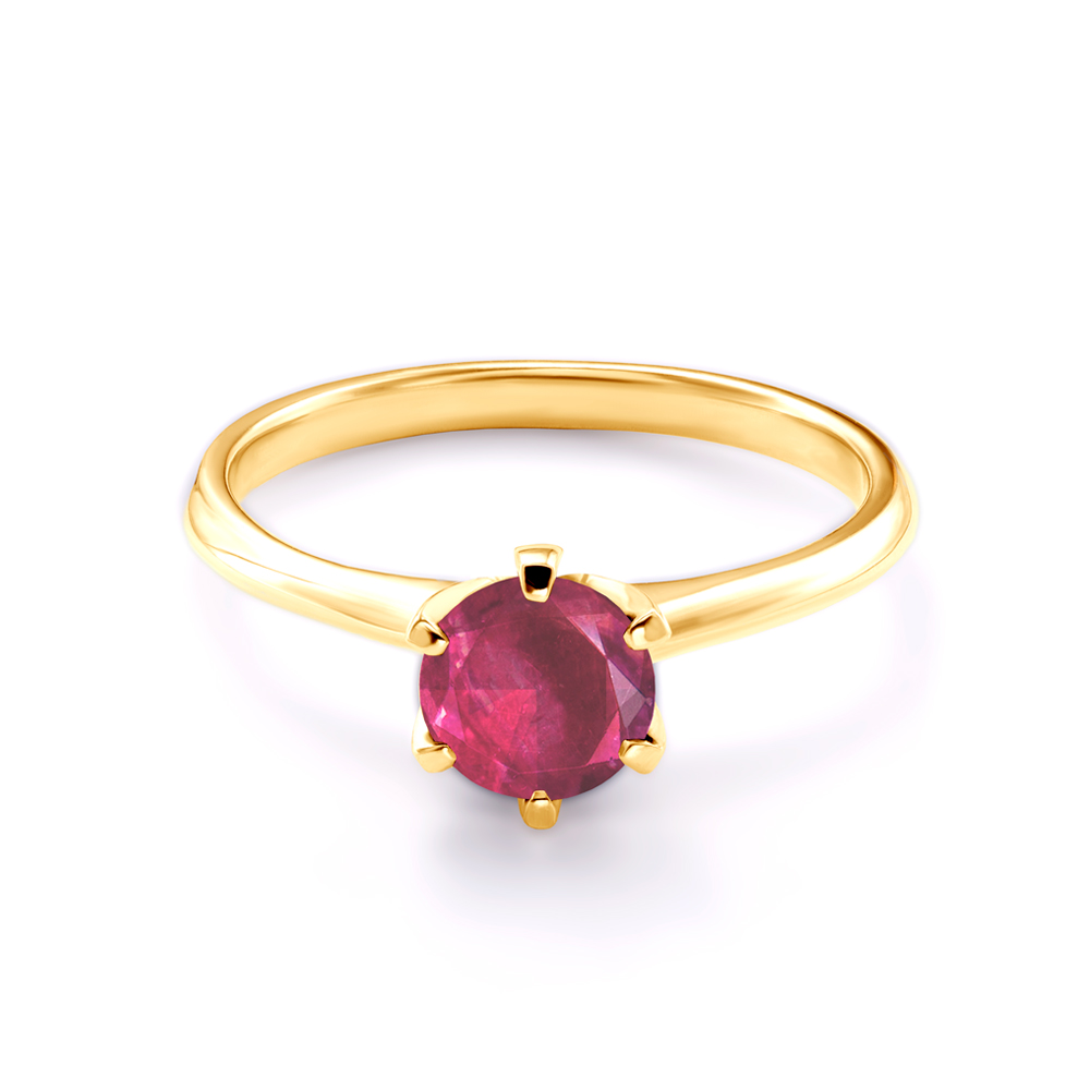 Pierścionek zaręczynowy z centralnie umieszczonym rubinem o masie 0,50 ct o szlifie brylantowym. Wykonany z 14-karatowego żółtego złota (próba 0,585).