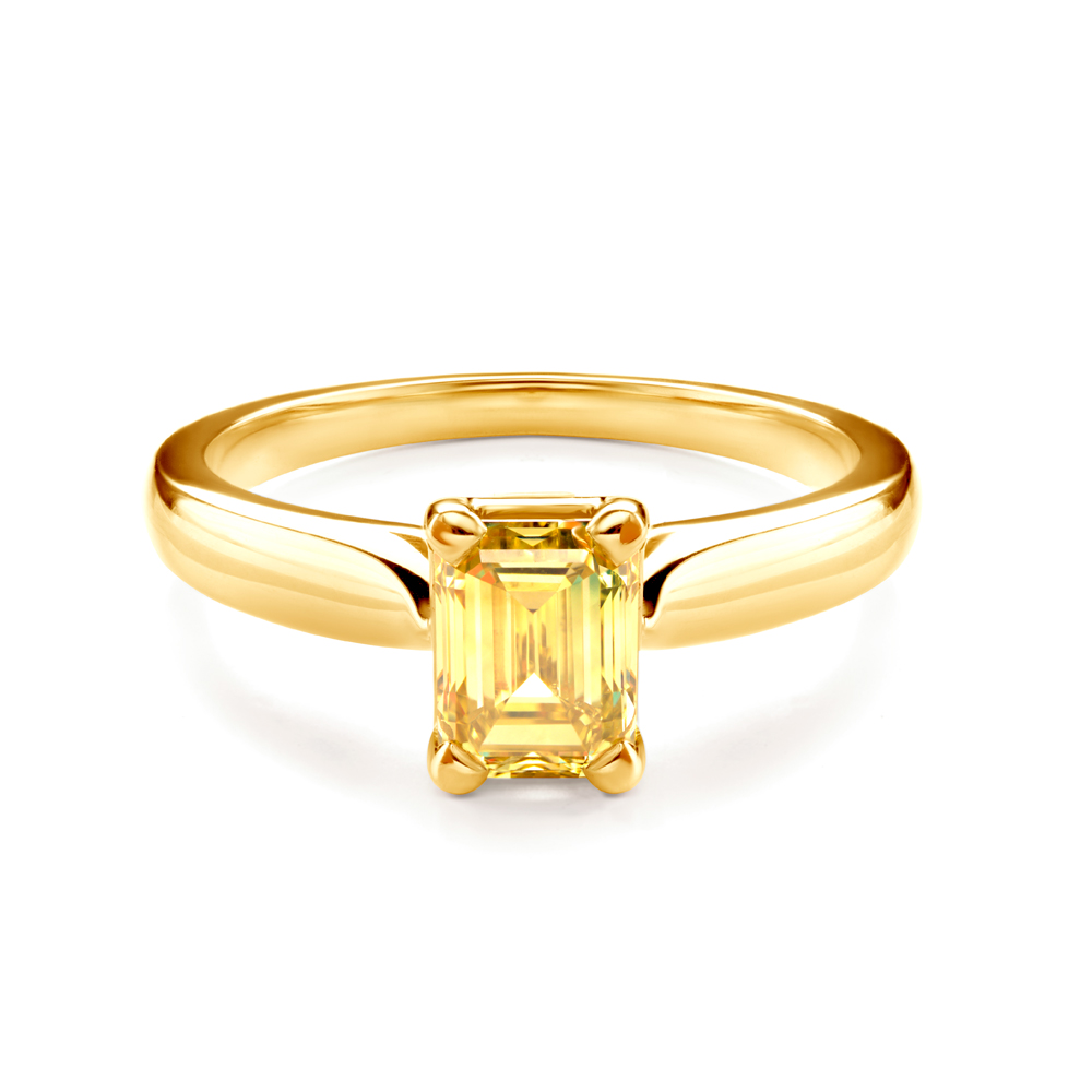 Pierścionek zaręczynowy z centralnie umieszczonym żółtym diamentem o masie 1,02 ct z perfekcyjnym szlifem szmaragdowym. Wykonany z 14-karatowego żółtego złota (próba 585).