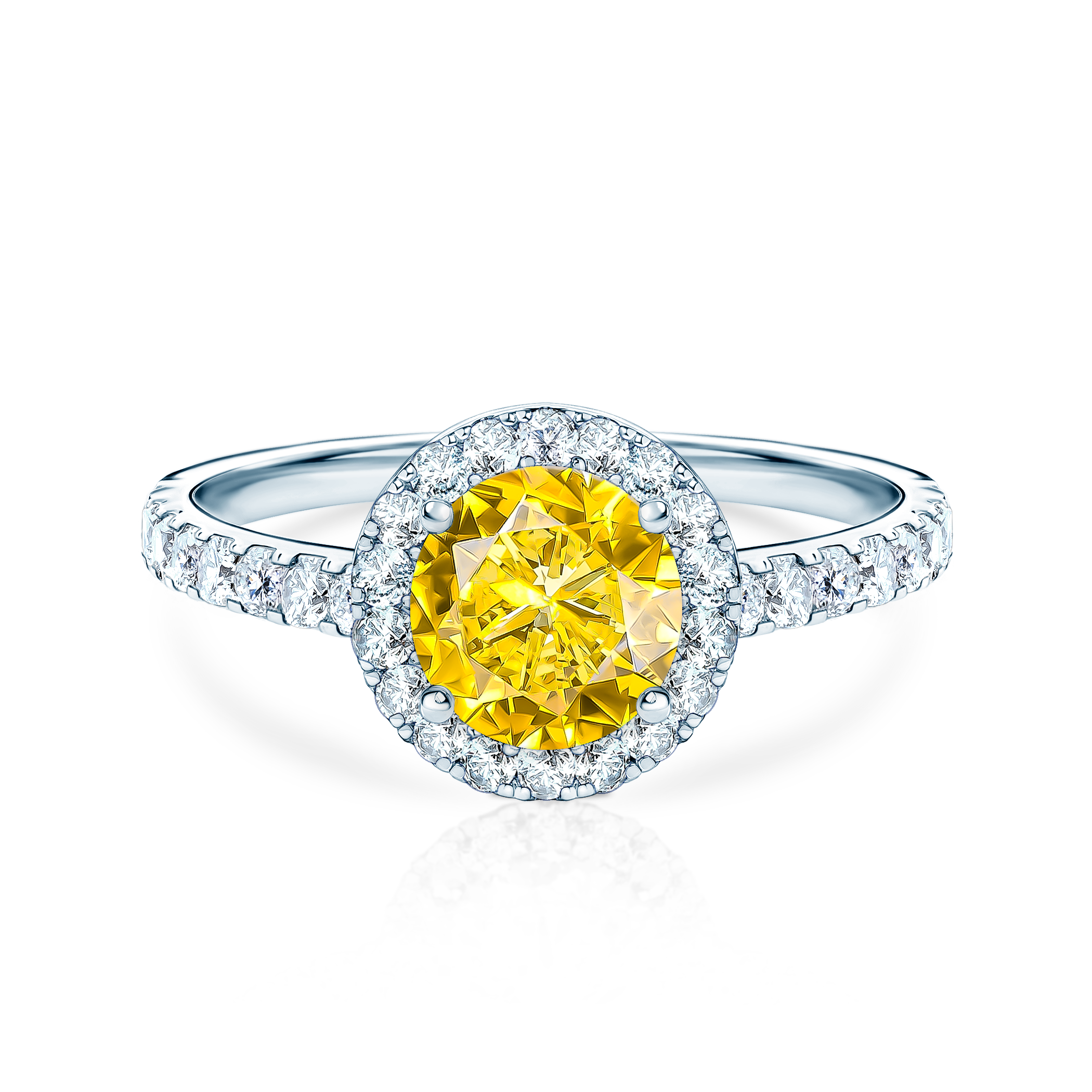 Pierścionek zaręczynowy z centralnym żółtym szafirem o masie 0,80 ct oraz bocznymi diamentami o łącznej masie 0,38 ct wysokiej czystości SI/H, o szlifie brylantowym. Wykonany z 14-karatowego białego złota (próba 0,585).