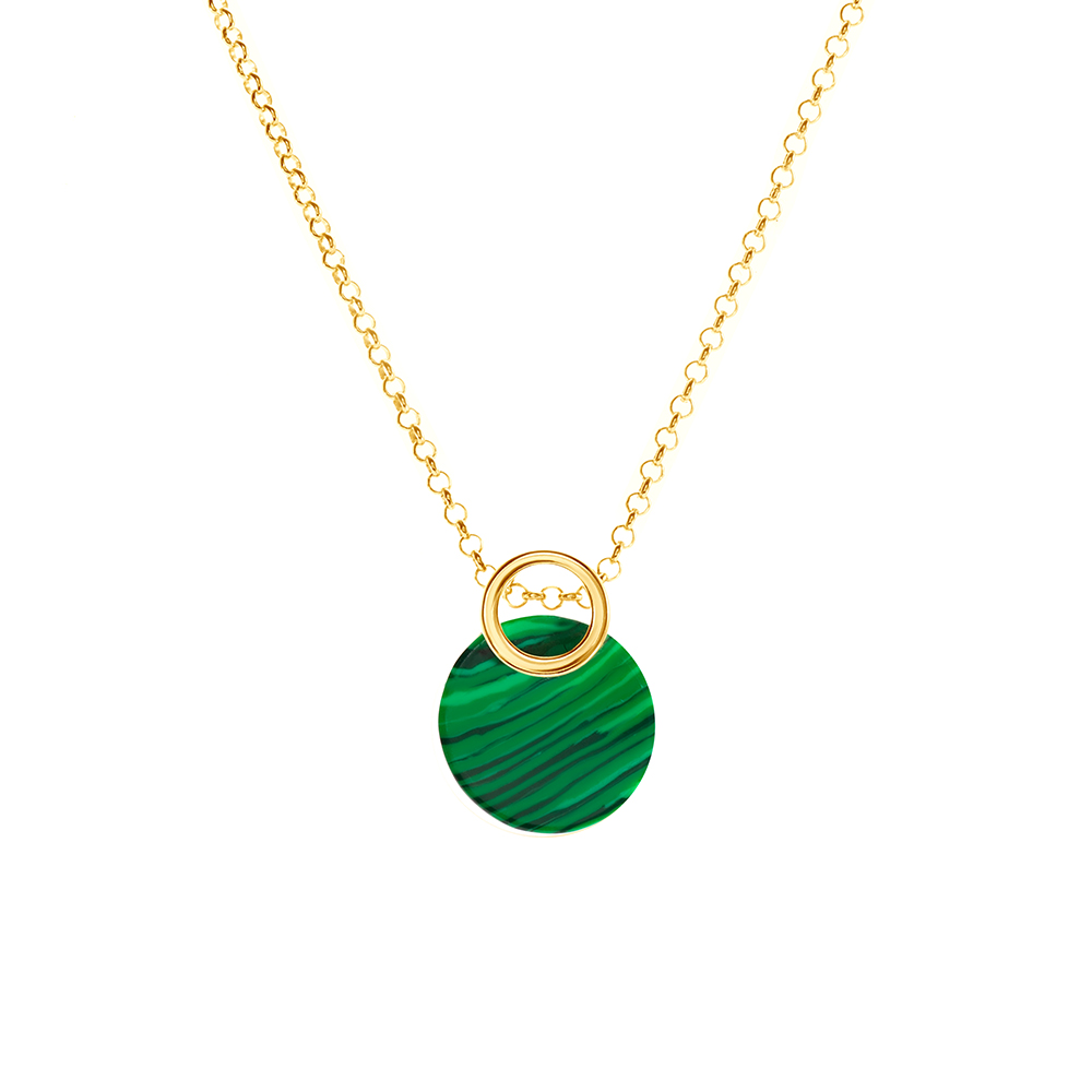 Naszyjnik Savicki wykonany ze srebra (próba 925) pozłocony 22-karatowym żółtym złotem. W naszyjniku został umieszczony malachit o głębokiej zieleni.
