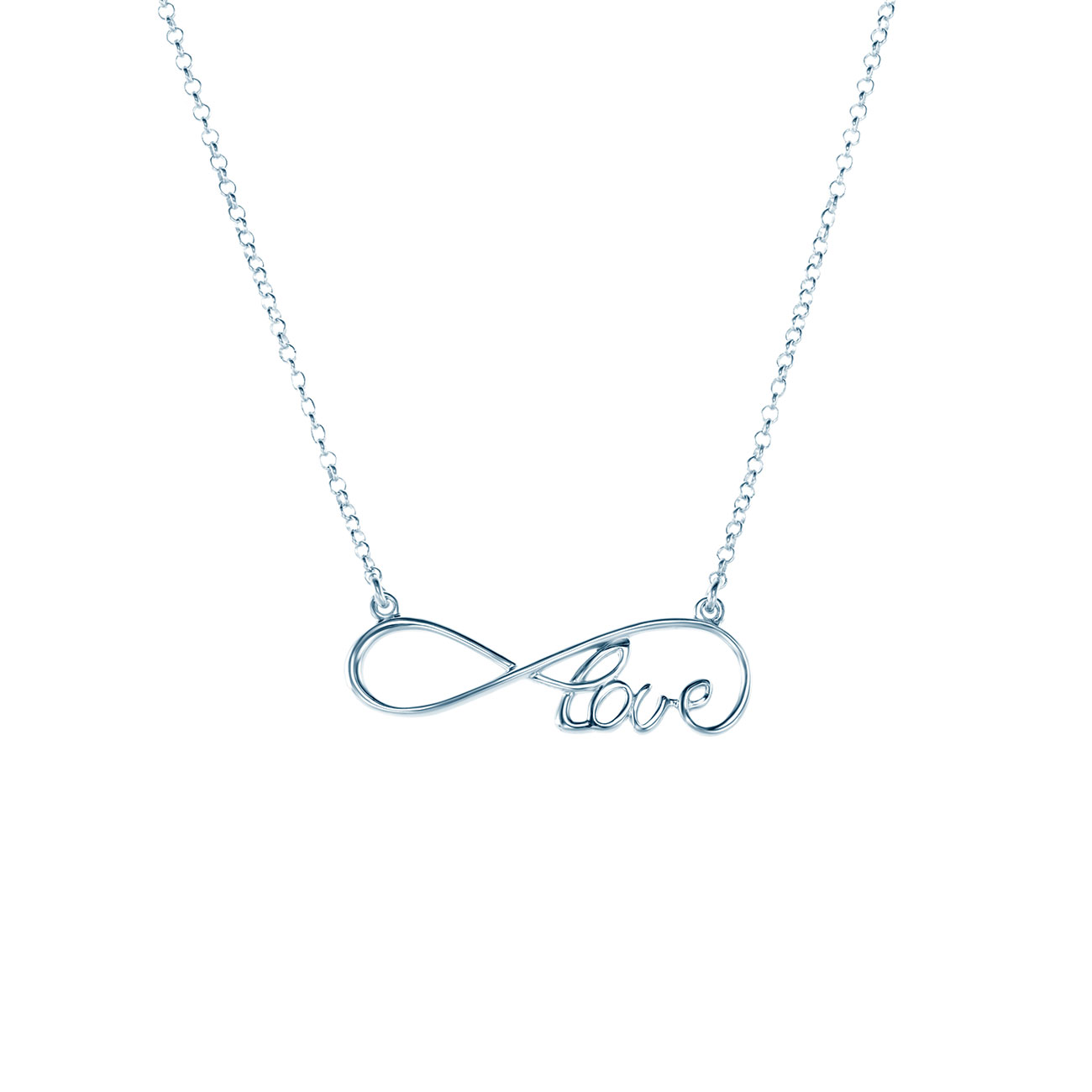 Naszyjnik został wykonany w kształcie znaku nieskończoności z napisem Love.