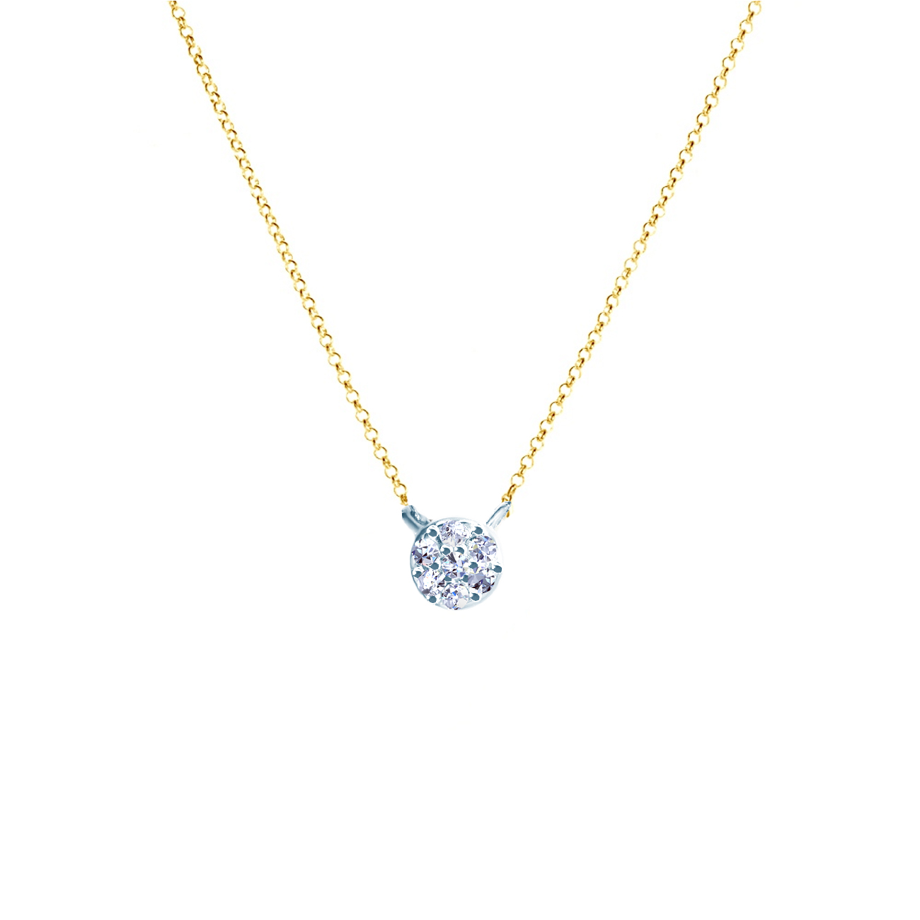 W naszyjniku zostało osadzonych 7 diamentów o łącznej masie 0,02 ct ze szlifem brylantowym. Naszyjnik wykonany z połączenia białego i żółtego złota(próba 585).