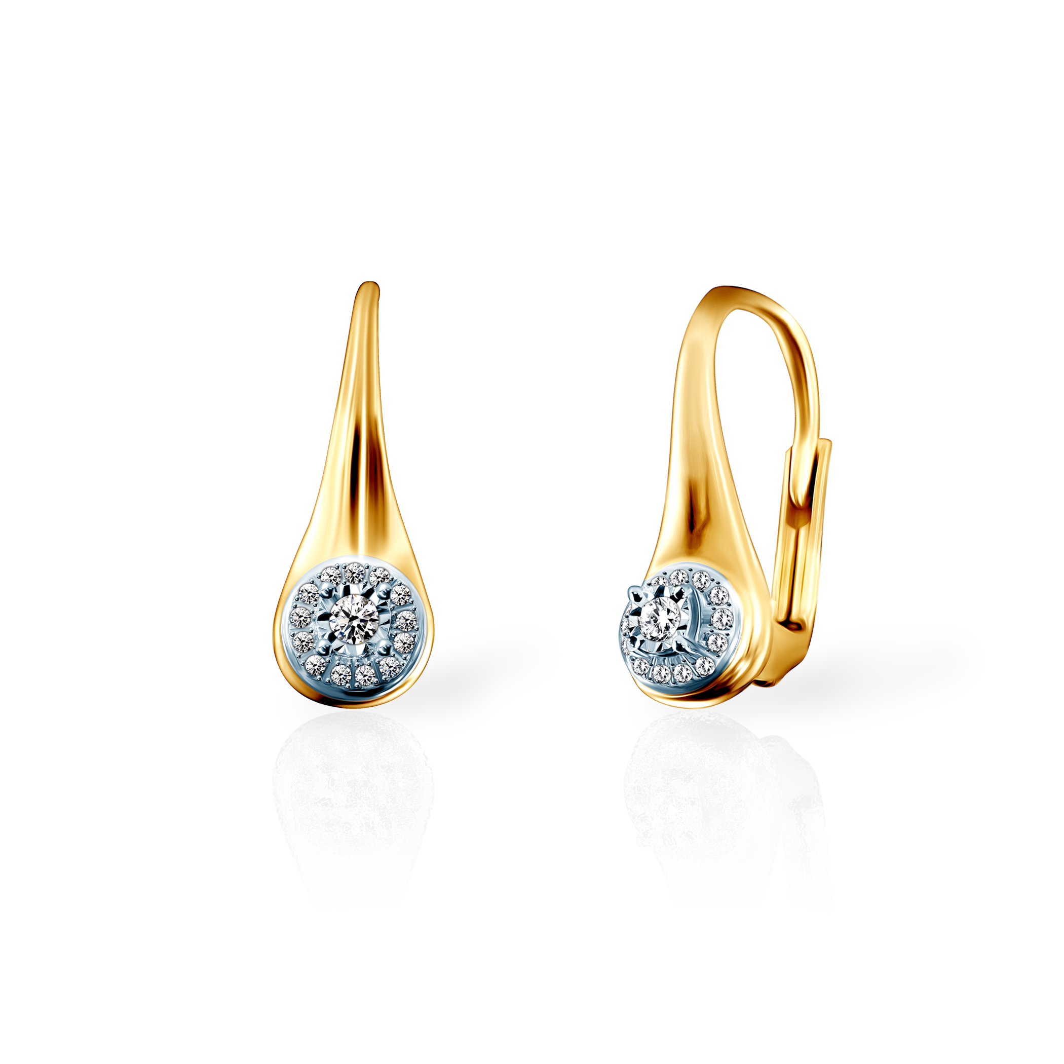 Kolczyki z 2 diamentami o łącznej masie 0,08 ct i szlifie brylantowym oraz z 26 diamentami o łącznej masie 0,07 ct, wykonane z połączenia 14-karatowego białego i żółtego złota (próba 585).