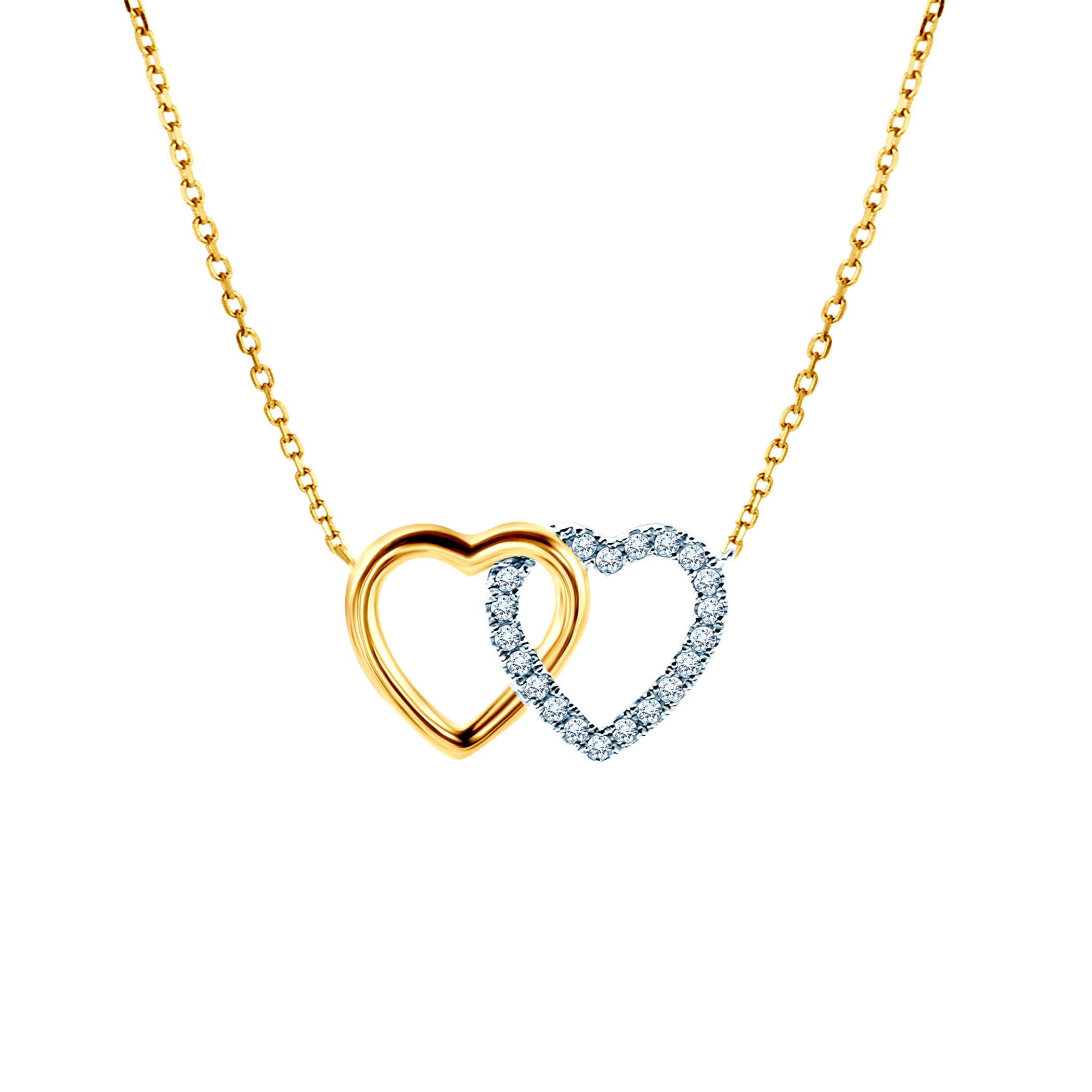 W naszyjniku zostało osadzonych 20 diamentów o szlifie brylantowym i łącznej masie 0,06 ct. Naszyjnik wykonany z połączenia białego i żółtego złota (próba 585).