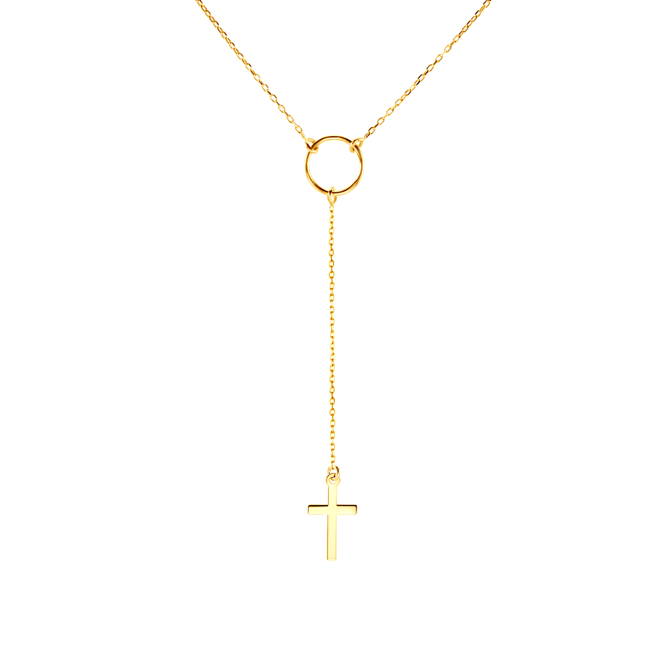 Złoty naszyjnik w kształcie krzyżyka wykonany z 14 karatowego żółtego złota (próba 585) o długości 42 cm.