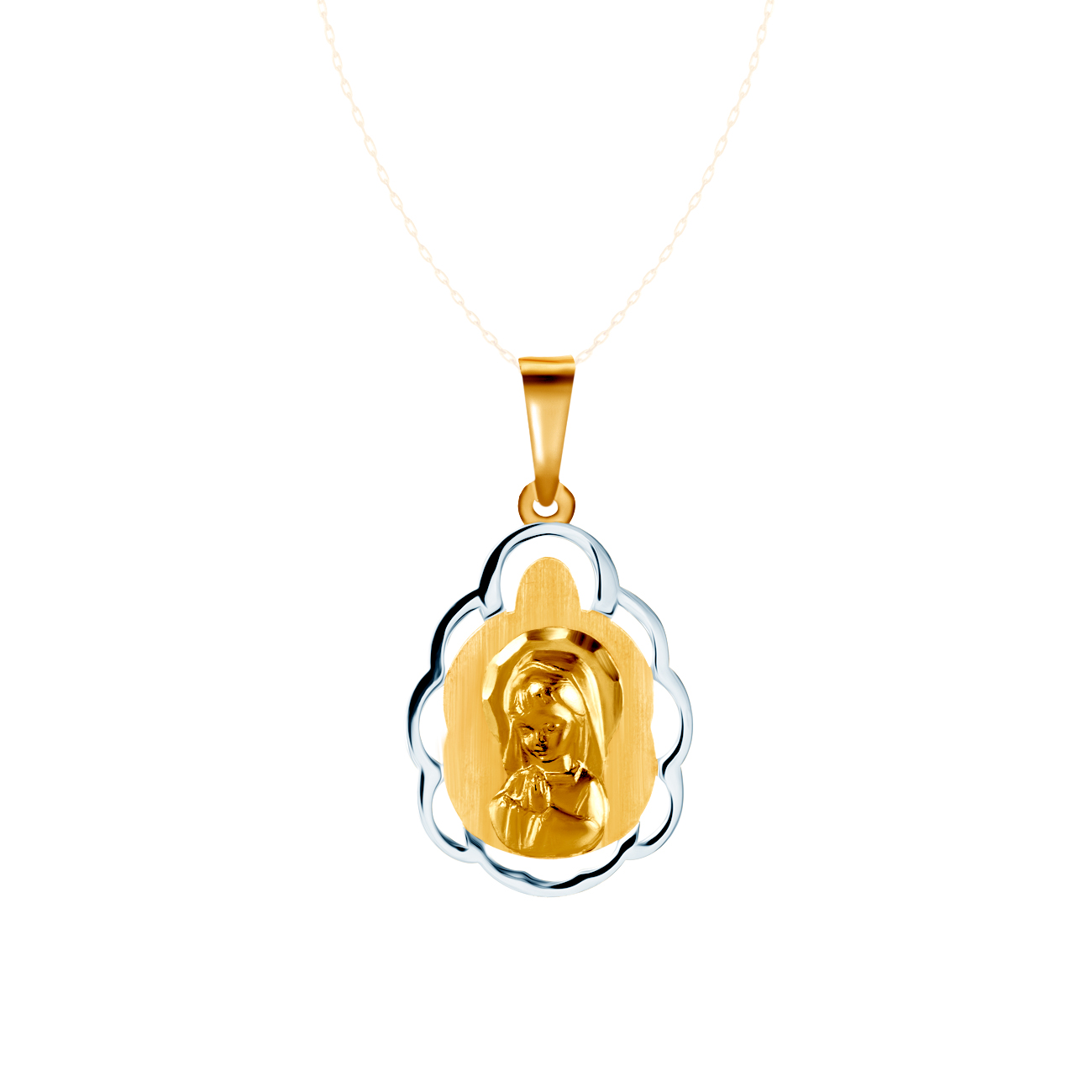 Złoty medalik wykonany z połączenia 14 karatowego białego i żółtego złota (próba 585).