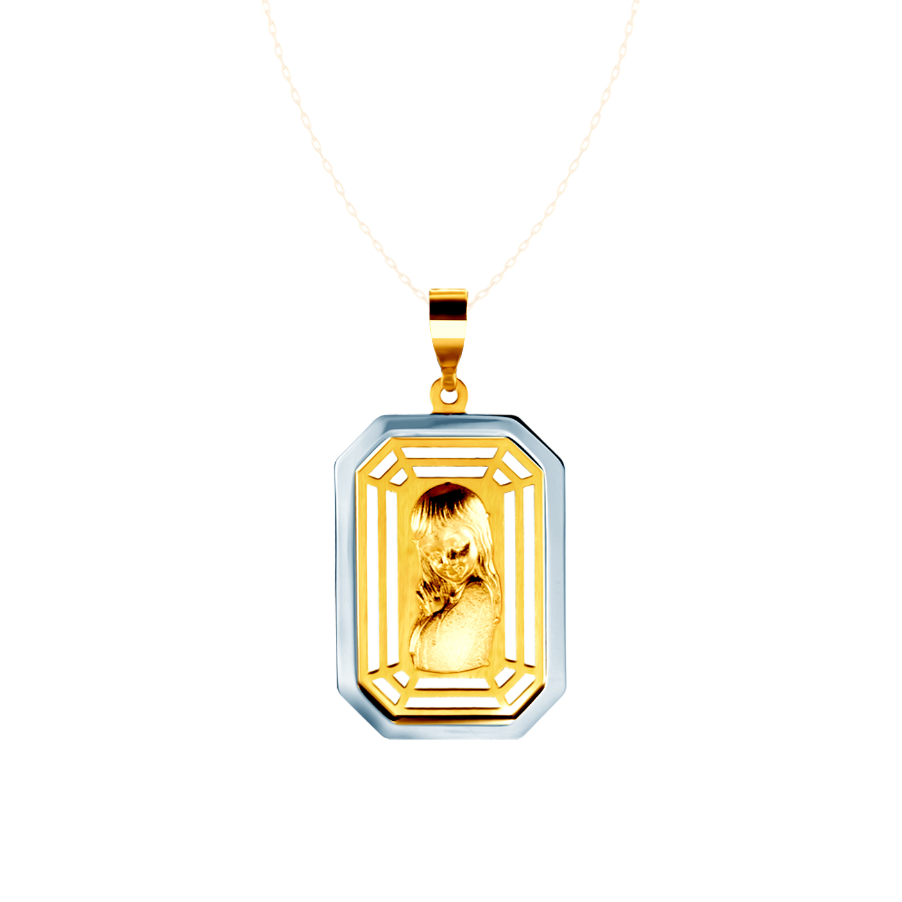 Złoty medalik wykonany z połączenia 14 karatowego białego i żółtego złota (próba 585).