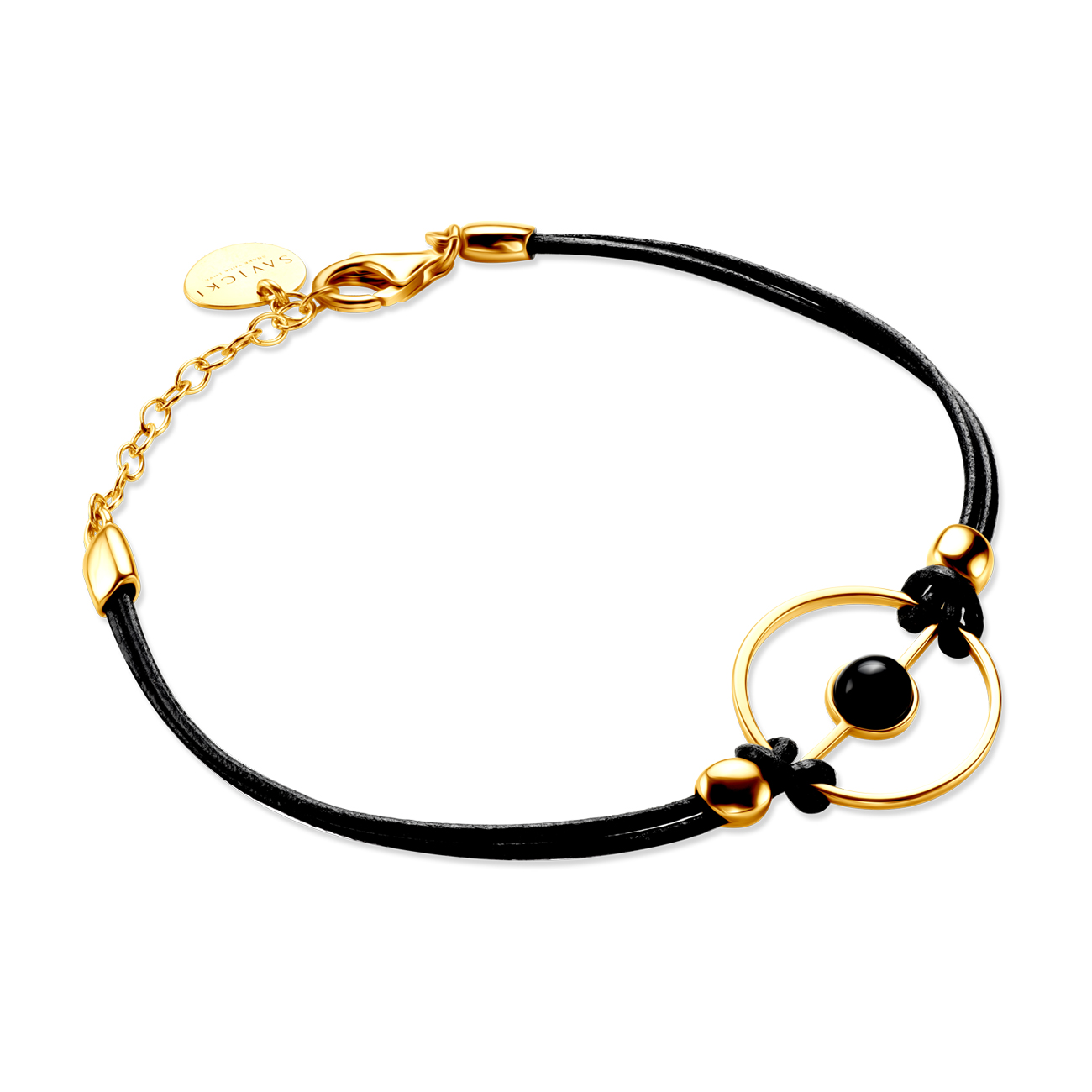 Bransoletka na rzemyku Savicki wykonana ze srebra (próba 925) o długości 19 cm, pozłocona 22-karatowym żółtym złotem. W bransoletce został osadzony onyks.