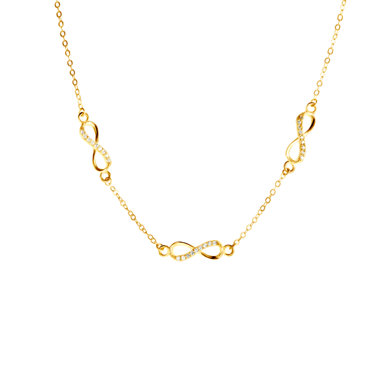 Naszyjnik celebrytka nieskończoność Savicki wykonany ze srebra (próba 925) pozłocony 22-karatowym żółtym złotem. W naszyjniku zostało osadzonych 29 cyrkonii o szlifie brylantowym.