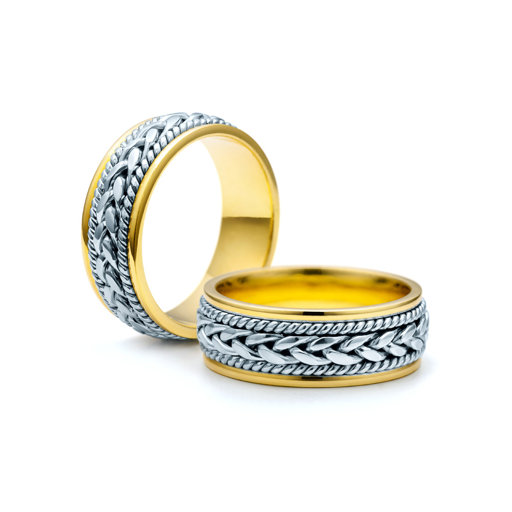 Obrączki ślubne wykonane z połączenia żółtego oraz białego złota (próba 0,333/0,585/0,750).