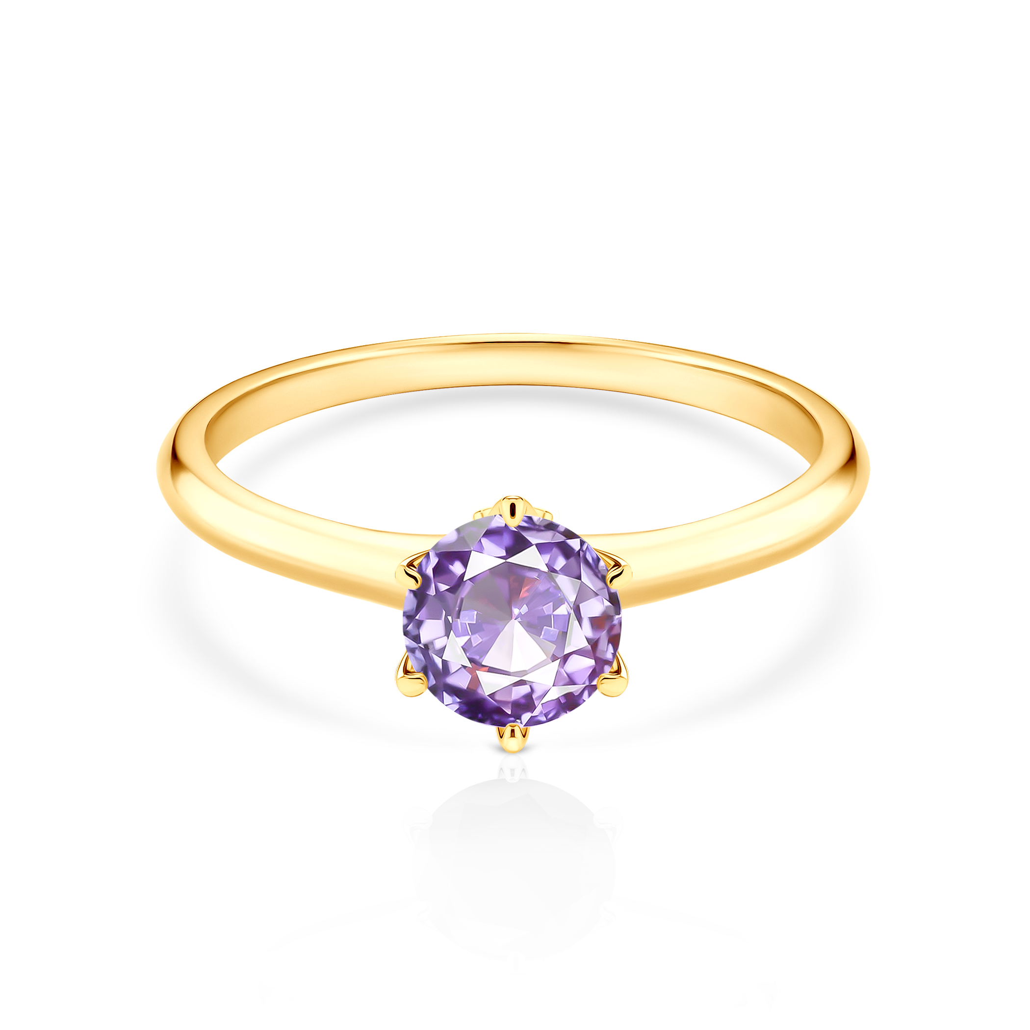 Pierścionek zaręczynowy z centralnie umieszczonym fioletowym szafirem o masie 0,50 ct oraz dwoma diamentami o łącznej masie 0,03 ct, wysokiej czystości SI/H, o szlifie brylantowym. Wykonany z 14-karatowego żółtego złota (próba 0,585).