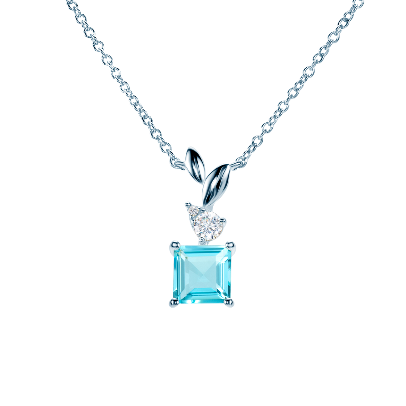 Naszyjnik celebrytka Savicki wykonany ze srebra (próba 925). W naszyjniku osadzony został niebieski topaz o masie 1,02 ct i szlifie princessa oraz 2 cyrkonie o szlifie brylantowym.