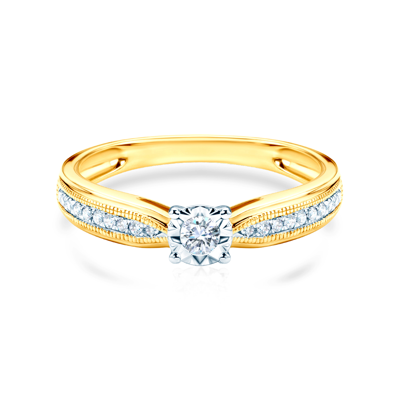 Pierścionek zaręczynowy z centralnym diamentem o masie 0,15 ct, szlifie brylantowym, czystości SI2/H, 16 diamentami o łącznej masie 0,12 ct, szlifie brylantowym, czystości SI2/H oraz 2 diamentami o łącznej masie 0,01 ct, szlifie brylantowym, czystości SI2/H wykonany z połączenia 14-karatowego żółtego i białego złota (próba 585).