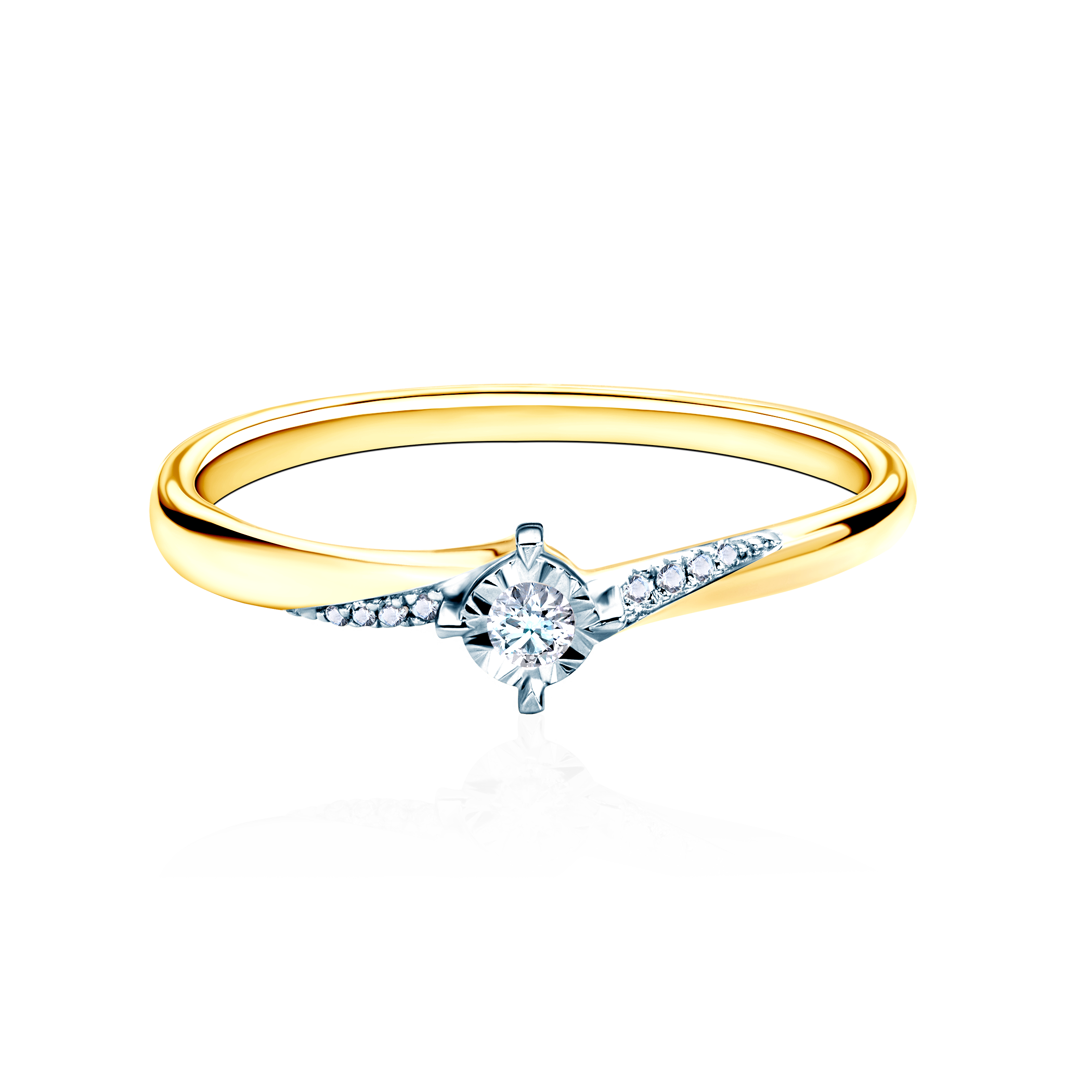 Pierścionek zaręczynowy z centralnym diamentem o masie 0,06 ct, szlifie brylantowym, czystości SI2/H i 8 diamentami o łącznej masie 0,02 ct, szlifie brylantowym, czystości SI2/H wykonany z połączenia 14-karatowego żółtego i białego złota (próba 585).