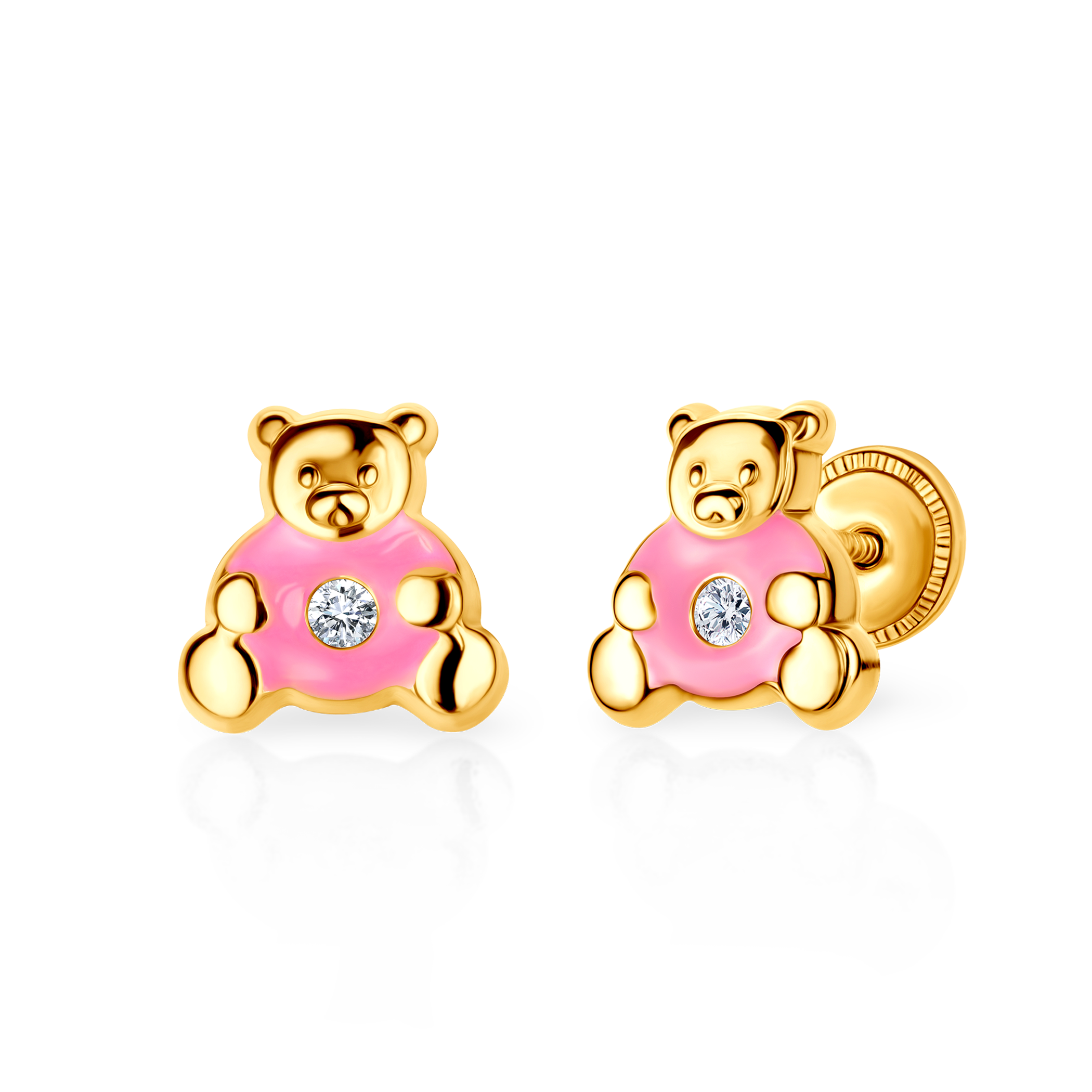 Kolczyki Savicki z motywem misia wykonane z 9-karatowego żółtego złota (próba 375). W kolczykach osadzone zostały 2 cyrkonie o szlifie brylantowym.