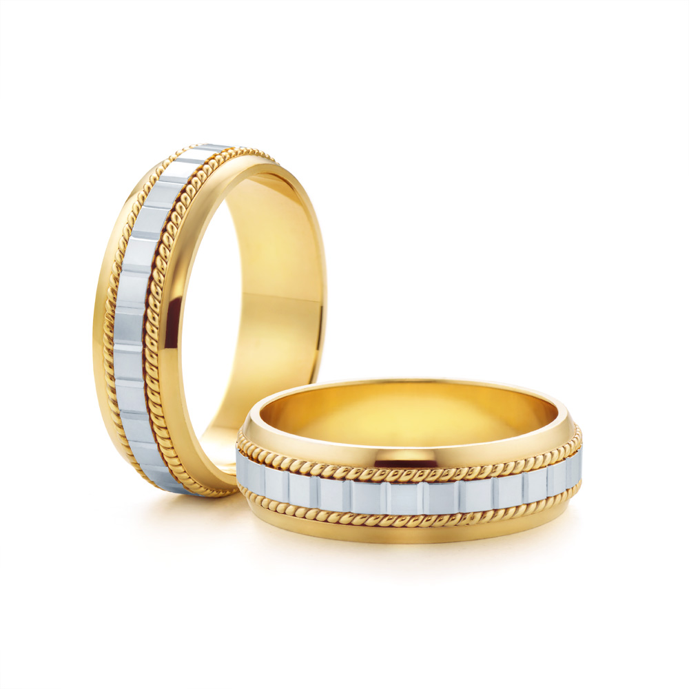 Obrączki ślubne wykonane z połączenia żółtego oraz białego złota (próba 0,333/0,585/0,750).