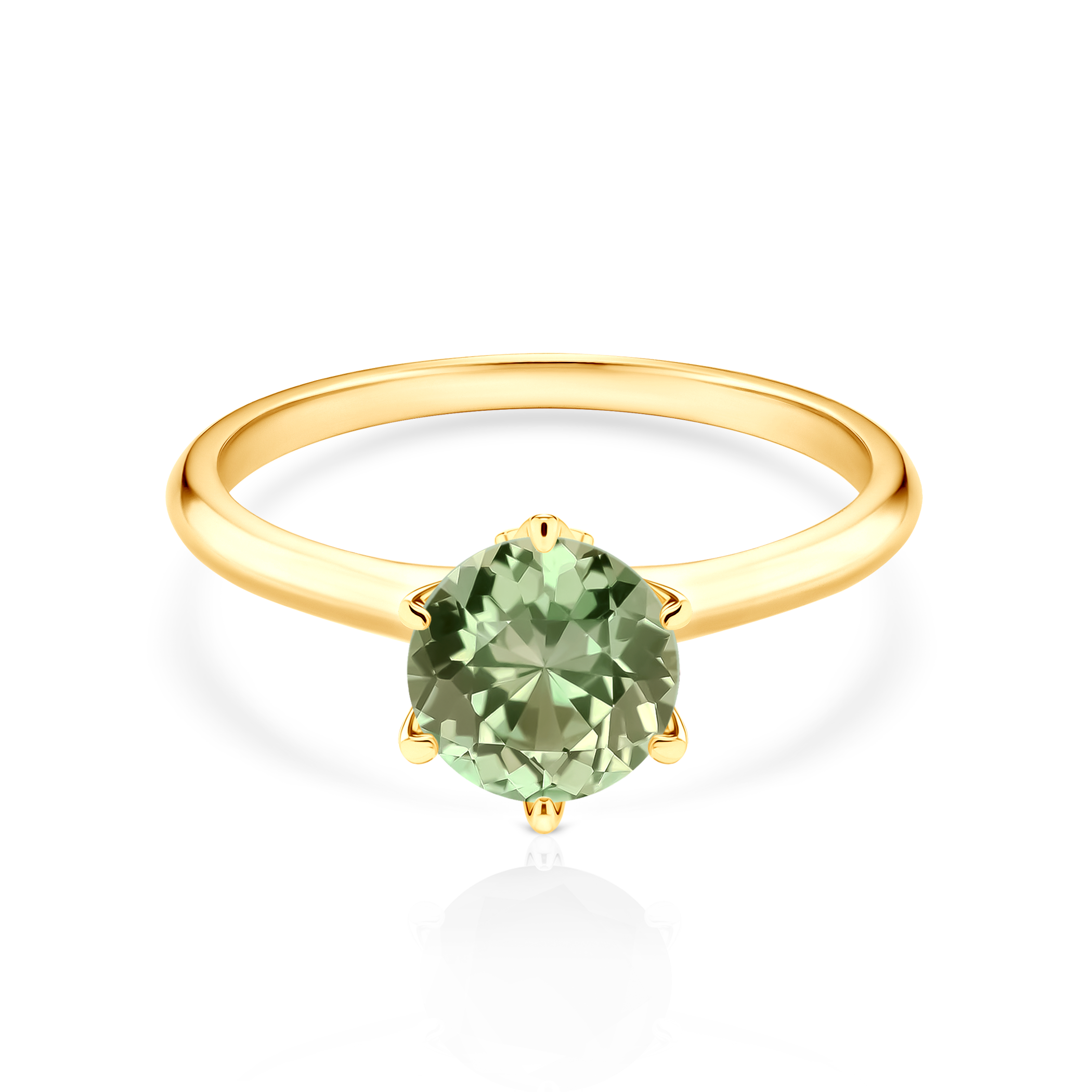 Pierścionek zaręczynowy z centralnie umieszczonym zielonym szafirem o masie 1,00 ct oraz dwoma diamentami o łącznej masie 0,03 ct, wysokiej czystości SI/H, o szlifie brylantowym. Wykonany z 14-karatowego żółtego złota (próba 0,585).