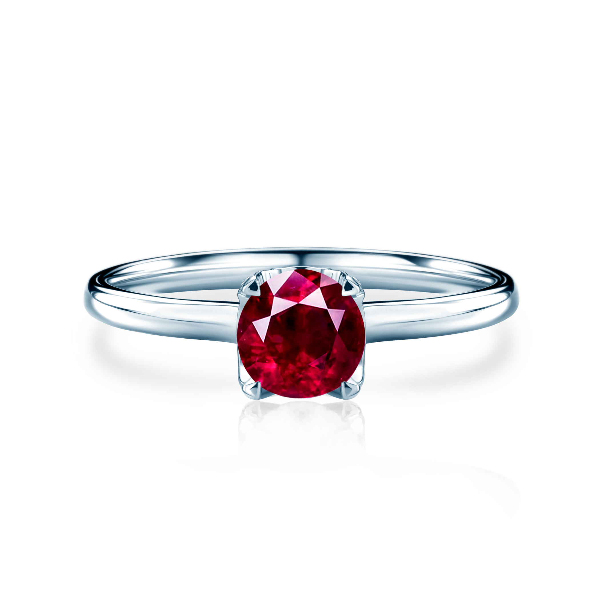 Pierścionek zaręczynowy z centralnie umieszczonym rubinem 0,50 ct o perfekcyjnym szlifie brylantowym oraz 48 diamentami o łącznej masie 0,12 ct oraz czystości i barwie SI2/H. Pierścionek został wykonany z 14-karatowego białego złota (próba 585).