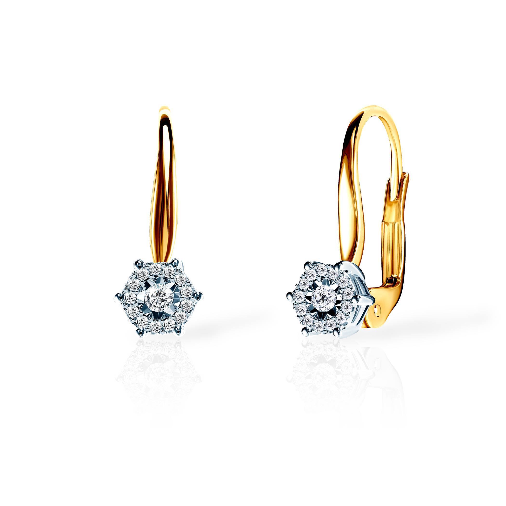 Kolczyki z 2 diamentami o łącznej masie 0,09 ct i szlifie brylantowym oraz 26 diamentami o łącznej masie 0,06 ct i szlifie brylantowym, wykonane z połączenia 14-karatowego białego i żółtego złota (próba 585).