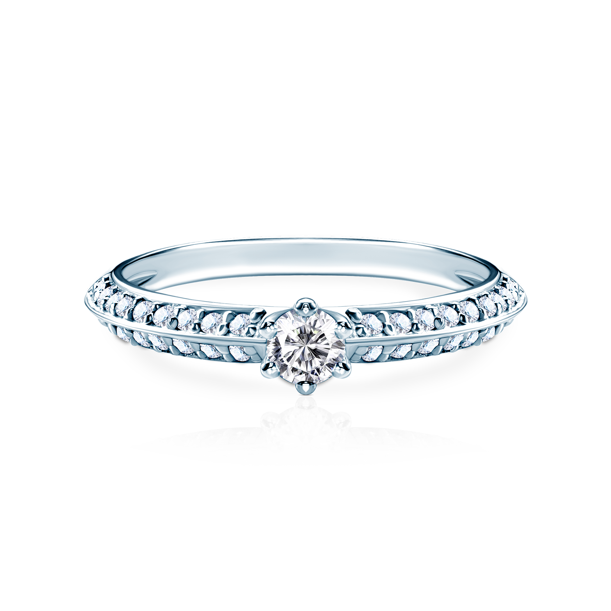 Pierścionek zaręczynowy z diamentem o masie 0,16 ct, szlifie brylantowym, czystości SI2/H oraz 36 diamentami o łącznej masie 0,27 ct, szlifie brylantowym, czystości SI2/H, wykonany z 14-karatowego białego złota (próba 585).