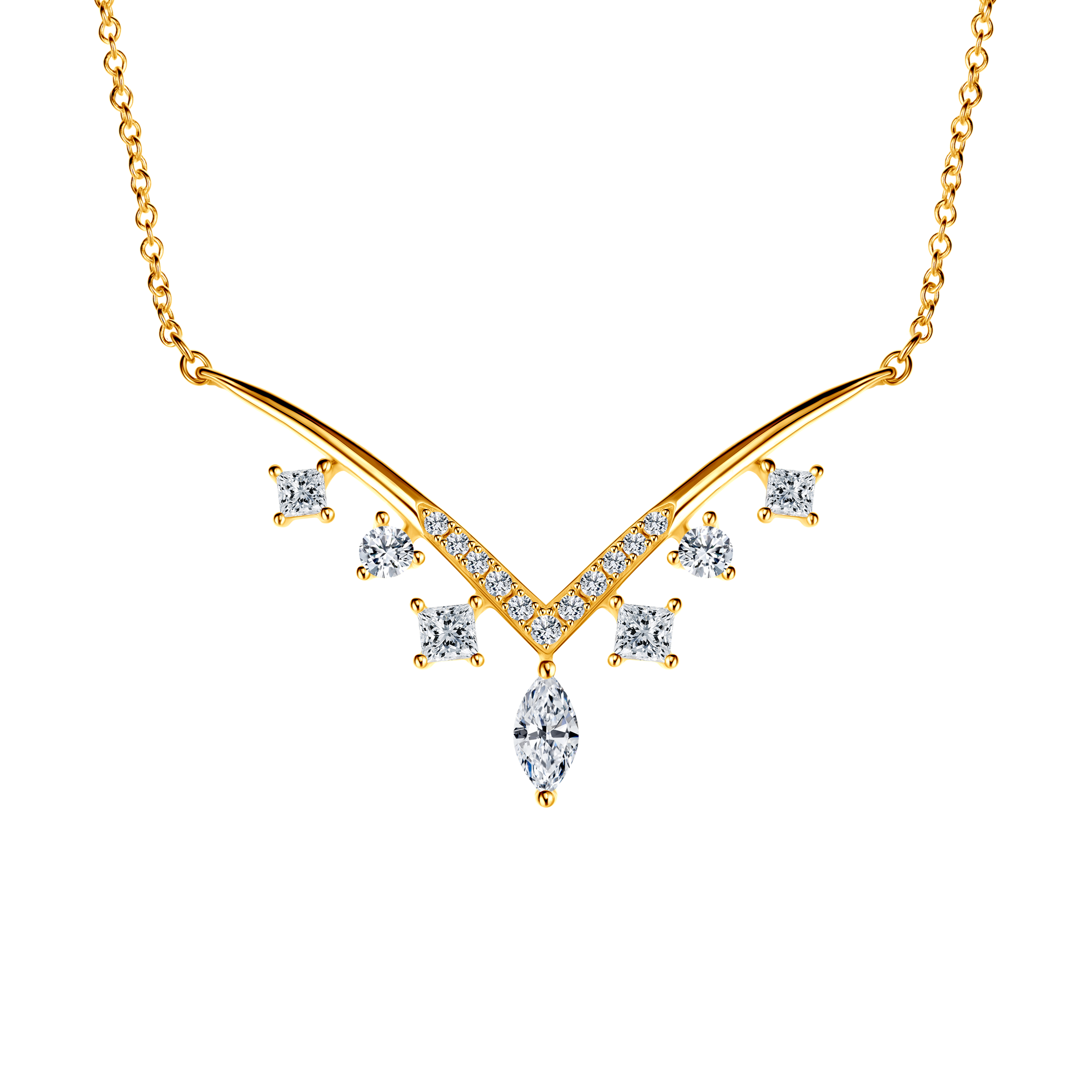 Naszyjnik Savicki wykonany ze srebra (próba 925) pozłocony żółtym złotem. W naszyjniku zostało osadzonych 18 cyrkonii o szlifach brylantowym, princessa, owalnym.