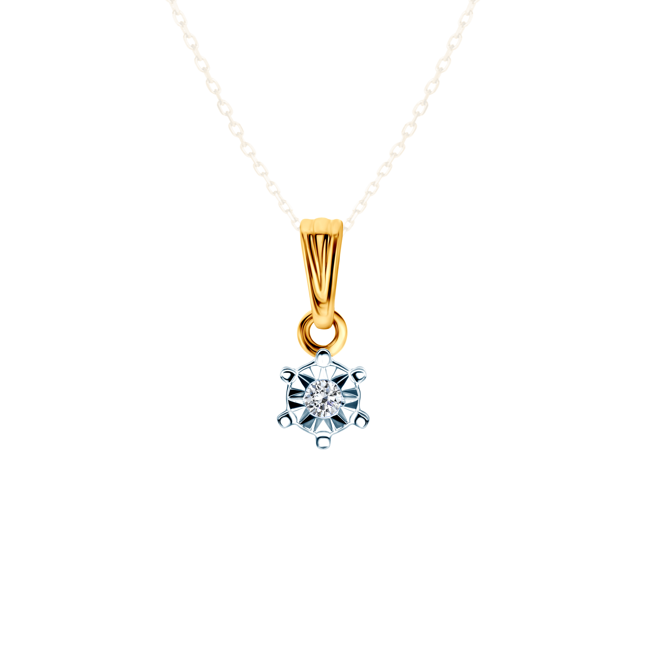 W zawieszce osadzony został diament o masie 0,015 ct, szlifie brylantowym i wysokiej czystości SI2/H. Zawieszka wykonana z połączenia 14-karatowego białego i żółtego złota (próba 585).