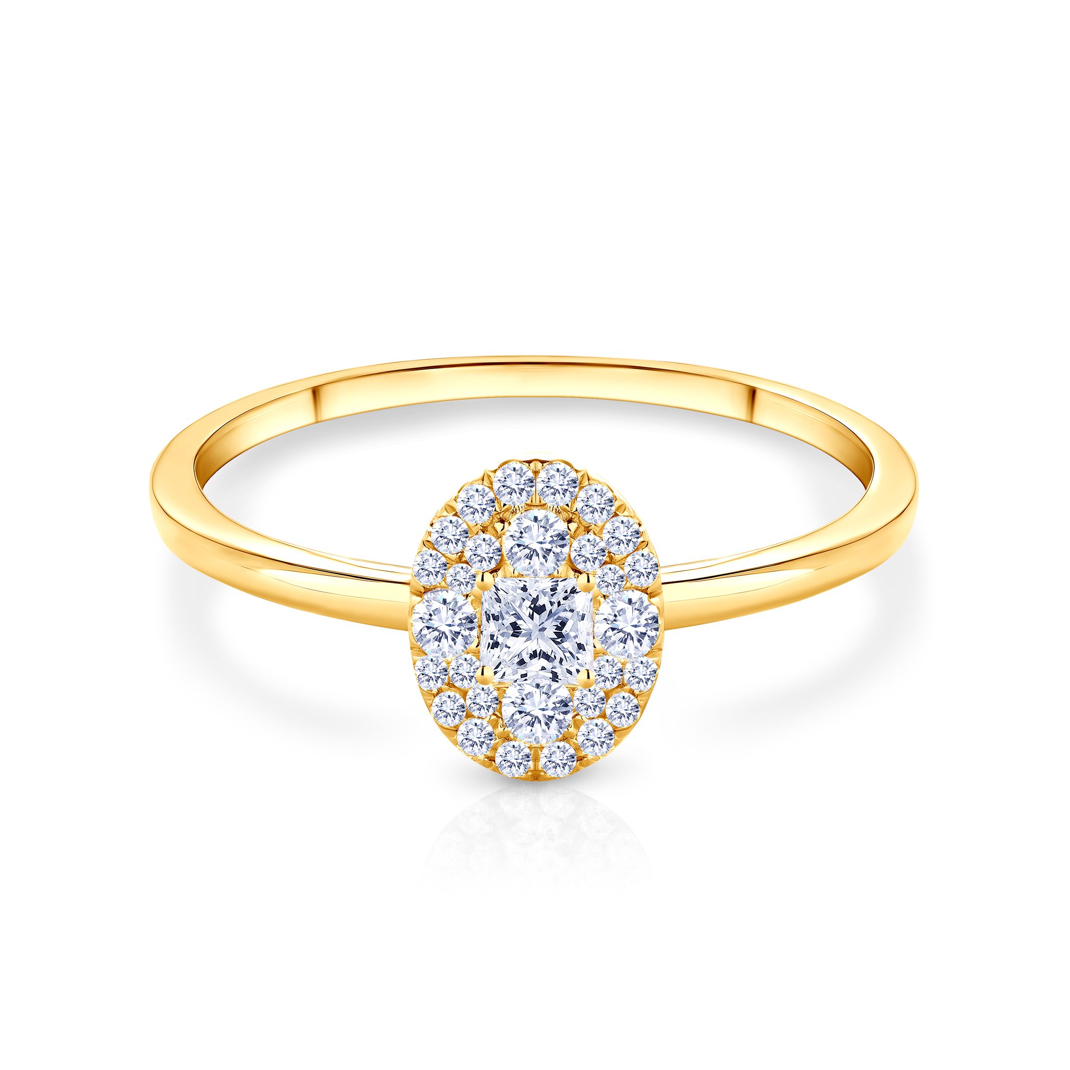 Pierścionek z diamentami wysokiej czystości SI2/H o łącznej masie 0,27ct. Wykonany z 14-karatowego żółtego złota (próba 0,585).