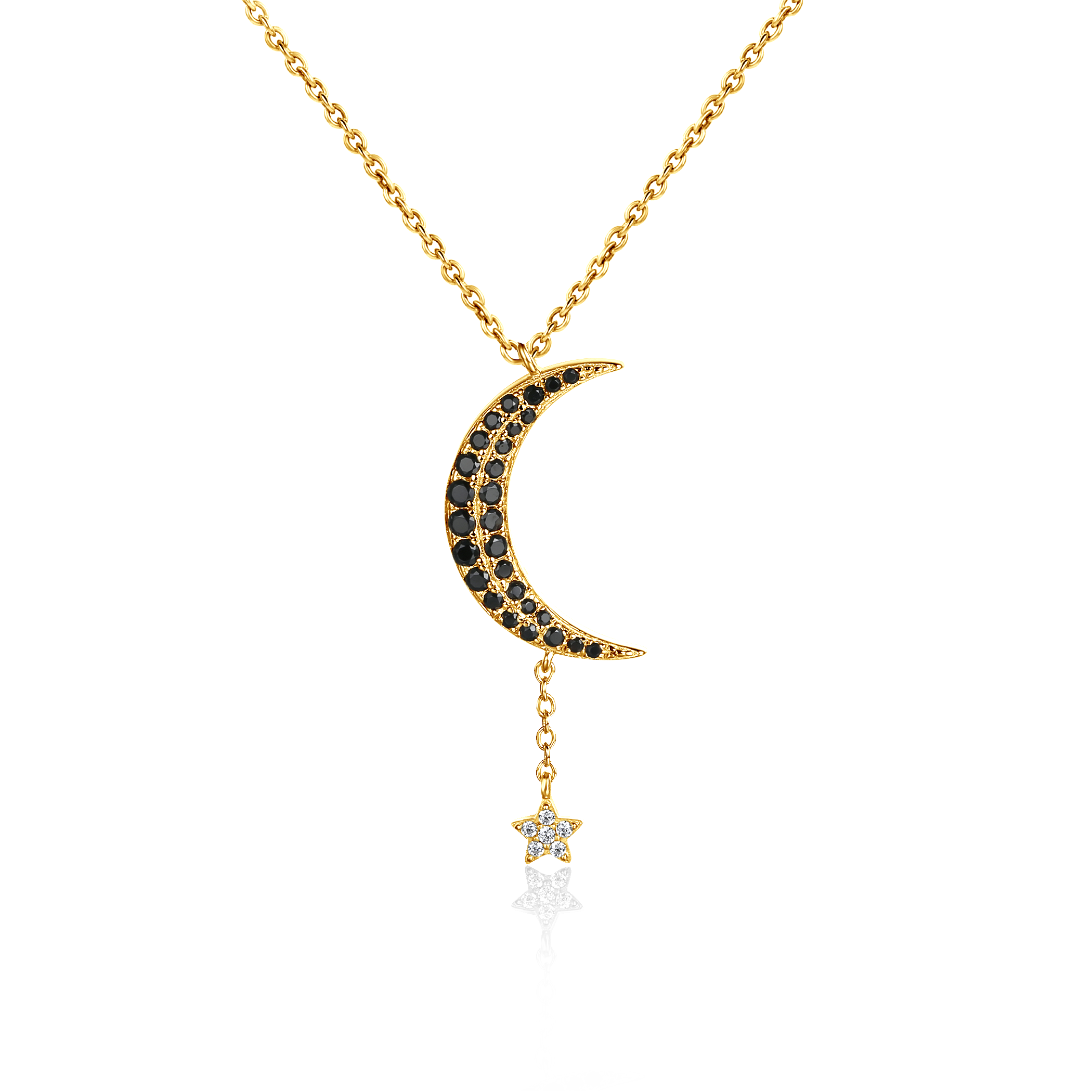 Naszyjnik celebrytka księżyc i gwiazda Savicki wykonany ze srebra (próba 925) pozłocony żółtym złotem. W naszyjniku osadzone zostały cyrkonie.