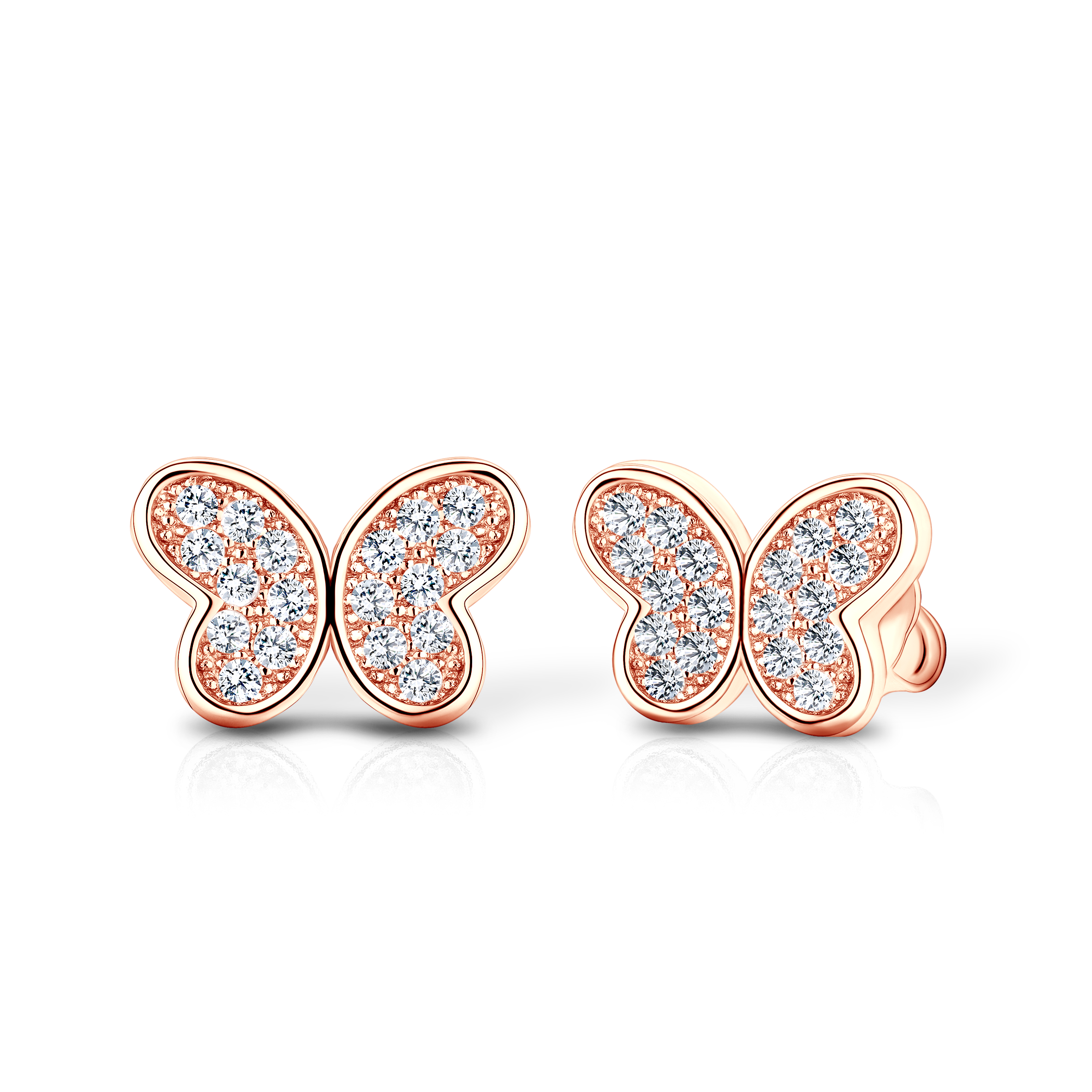 Kolczyki z motywem motylka wykonane ze srebra (pr. 925), pozłacanego różowym złotem, z cyrkoniami.