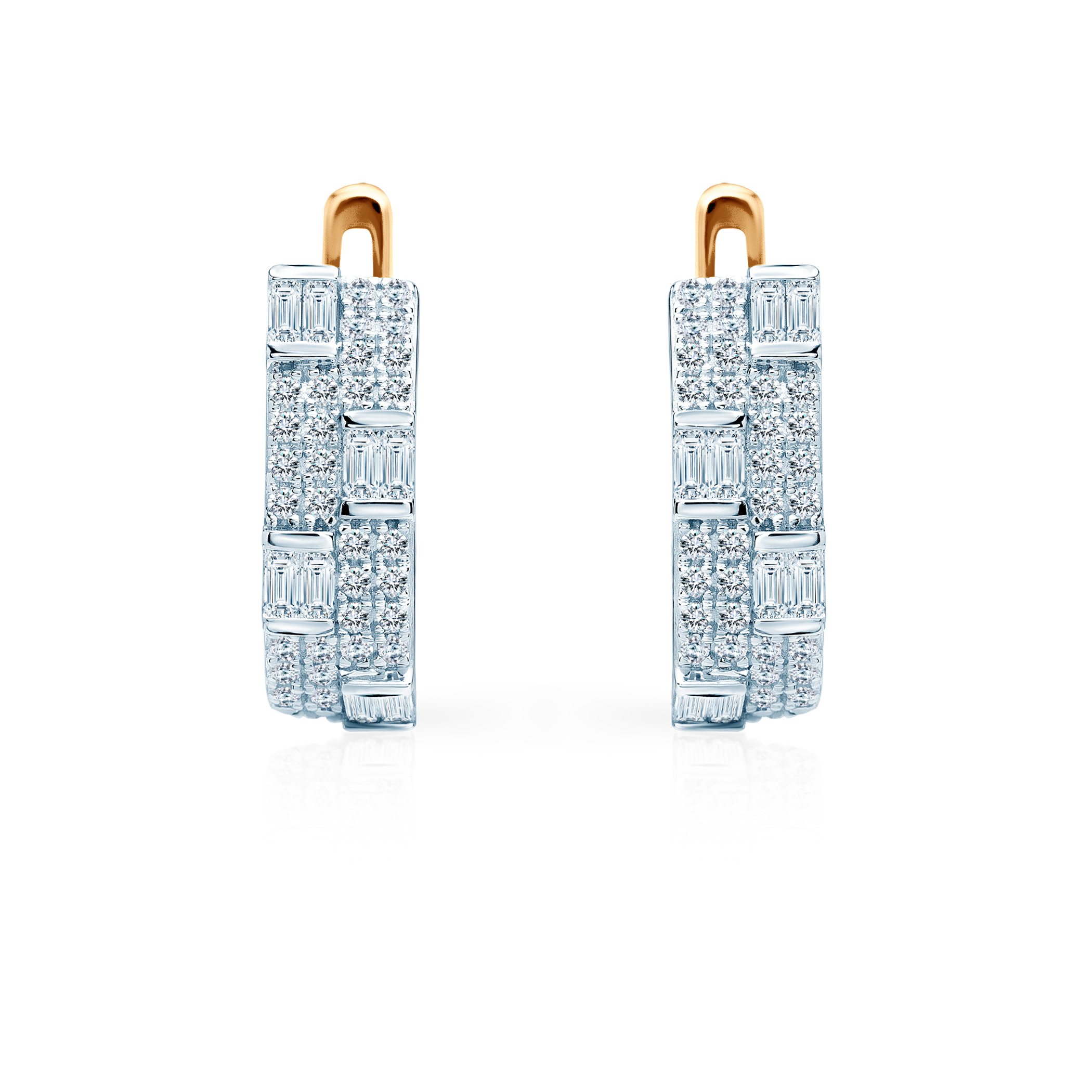 Kolczyki z 64 diamentami o łącznej masie 0,24 ct i szlifie brylantowym, oraz 16 diamentami o szlifie bagieta o masie 0,22ct, wykonane z połączenia białego i żółtego złota(próba 585).