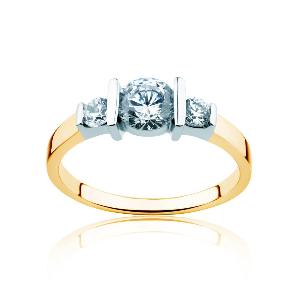 Pierścionek zaręczynowy z diamentem centralnym o masie 0,65 ct o szlifie brylantowym, wysokiej czystości SI/H oraz dwoma diamentami 0,10 ct o szlifie brylantowym. Wykonany z połączenia 14-karatowego żółtego oraz białego złota (próba 0,585).