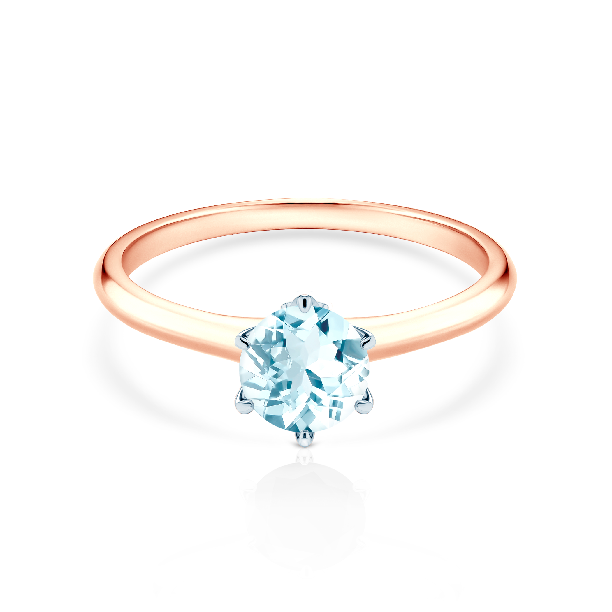 Pierścionek zaręczynowy z centralnie umieszczonym akwamarynem o masie 0,50 ct oraz dwoma diamentami o łącznej masie 0,03 ct, wysokiej czystości SI/H, o szlifie brylantowym. Wykonany z 14-karatowego dwukolorowego złota (próba 0,585).