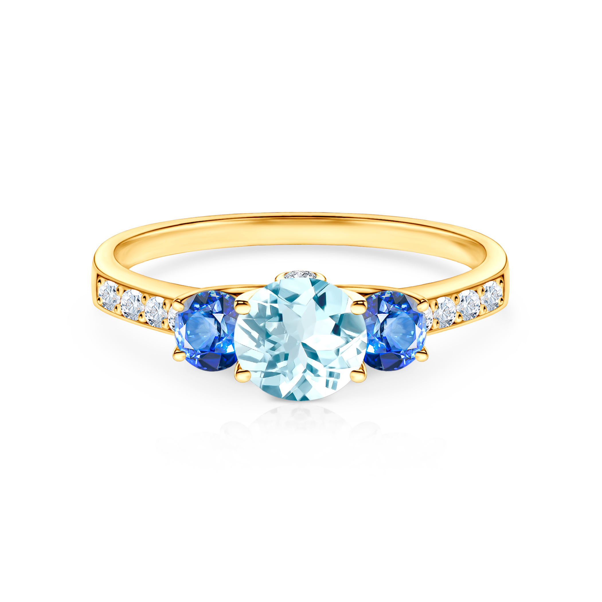 Pierścionek zaręczynowy z centralnie umieszczonym akwamarynem o masie 0,50 ct oraz dwoma niebieskimi szafirami o łącznej masie 0,24 ct. Boczne diamenty posiadają łączną masę 0,15 ct o wysokiej czystości SI/H i szlifie brylantowym. Wykonany z 14-karatowego żółtego złota (próba 585).