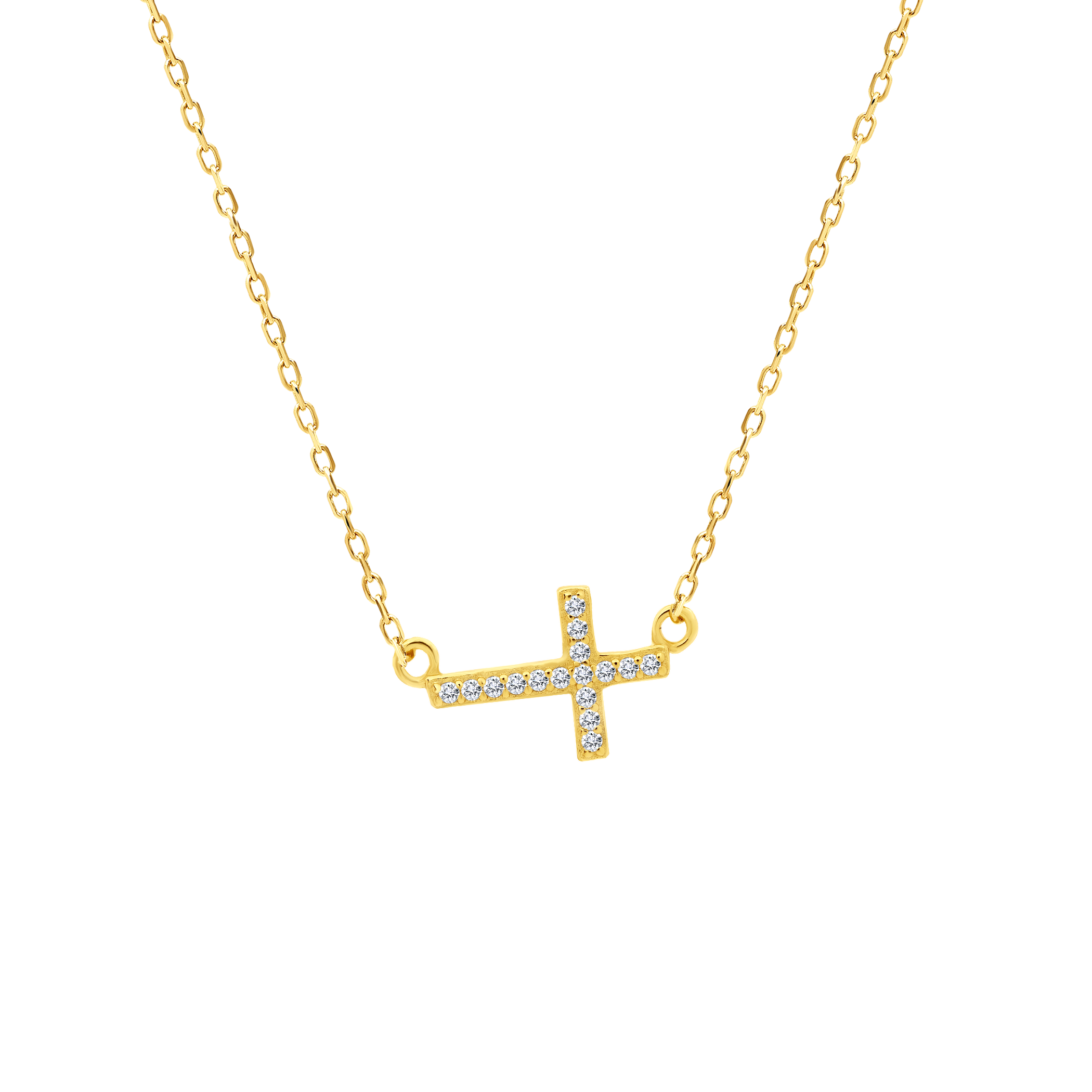Naszyjnik choker krzyżyk Savicki wykonany ze srebra (próba 925) pozłocony żółtym złotem. W naszyjniku osadzona zostały cyrkonie o szlifie brylantowym.