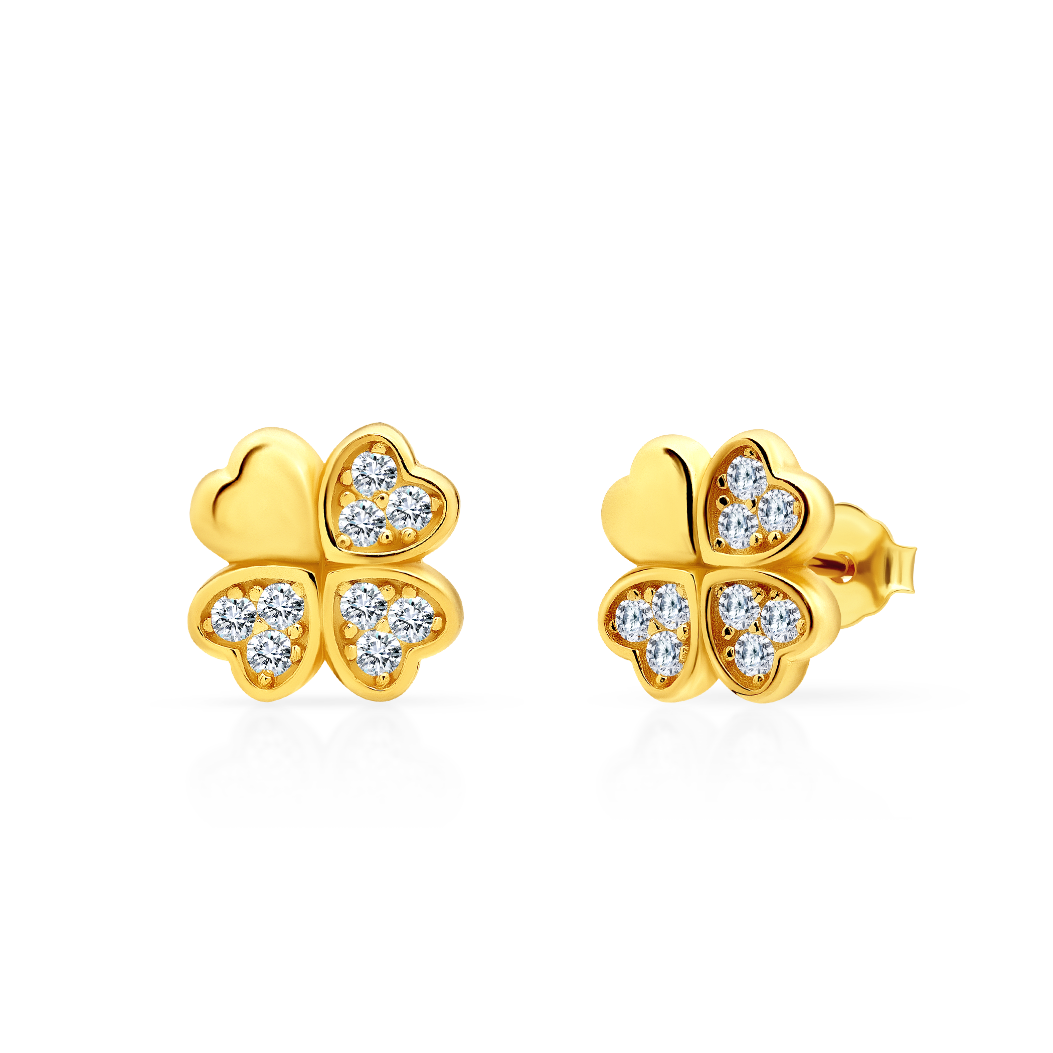 Kolczyki koniczynka wykonane ze srebra (pr.925), pozłacane żółtym złotem. W kolczykach osadzone zostały cyrkonie o szlifie brylantowym.
