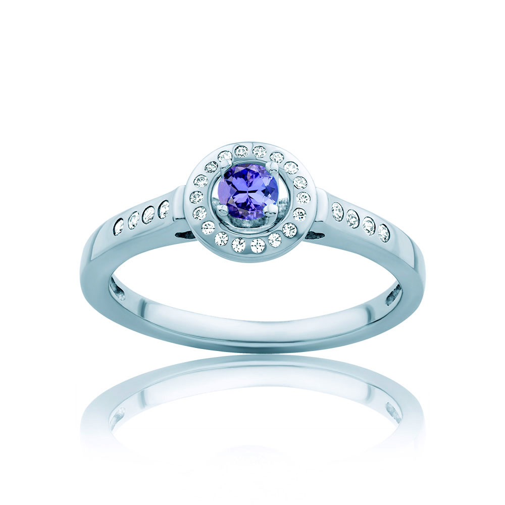 Pierścionek z tanzanitem oraz 26 diamentami o szlifie brylantowym wysokiej czystości SI/H, o łącznej masie 0,24 ct. Wykonany z 14-karatowego białego złota (próba 0,585).