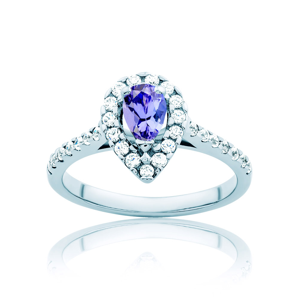 Pierścionek z tanzanitem o masie 0,45 ct oraz 29 diamentami o szlifie brylantowym wysokiej czystości SI/H, o łącznej masie 0,35 ct (29x0,0122 ct). Wykonany z 14-karatowego białego złota (próba 0,585).
