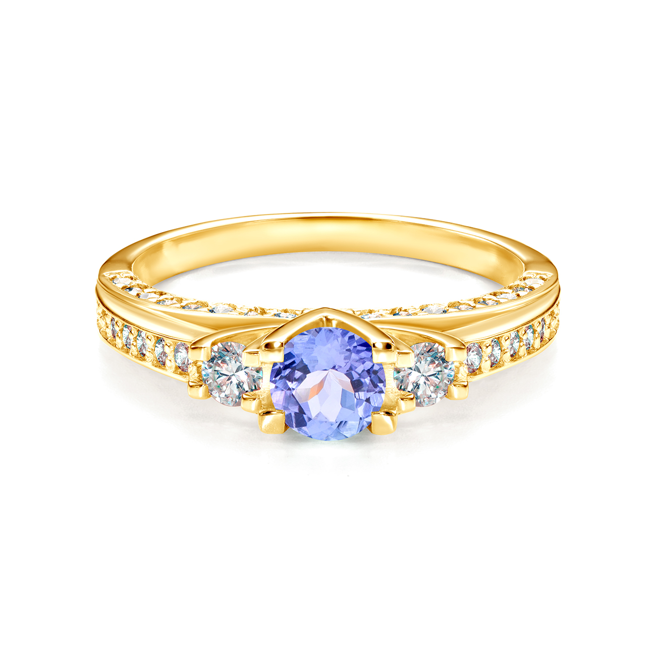 Pierścionek z tanzanitem oraz 48 diamentami o szlifie brylantowym wysokiej czystości SI/H, o łącznej masie 0,45 ct (2x0,08 ct; 32x0,006 ct; 14x0,007). Wykonany z 14-karatowego żółtego złota (próba 0,585).