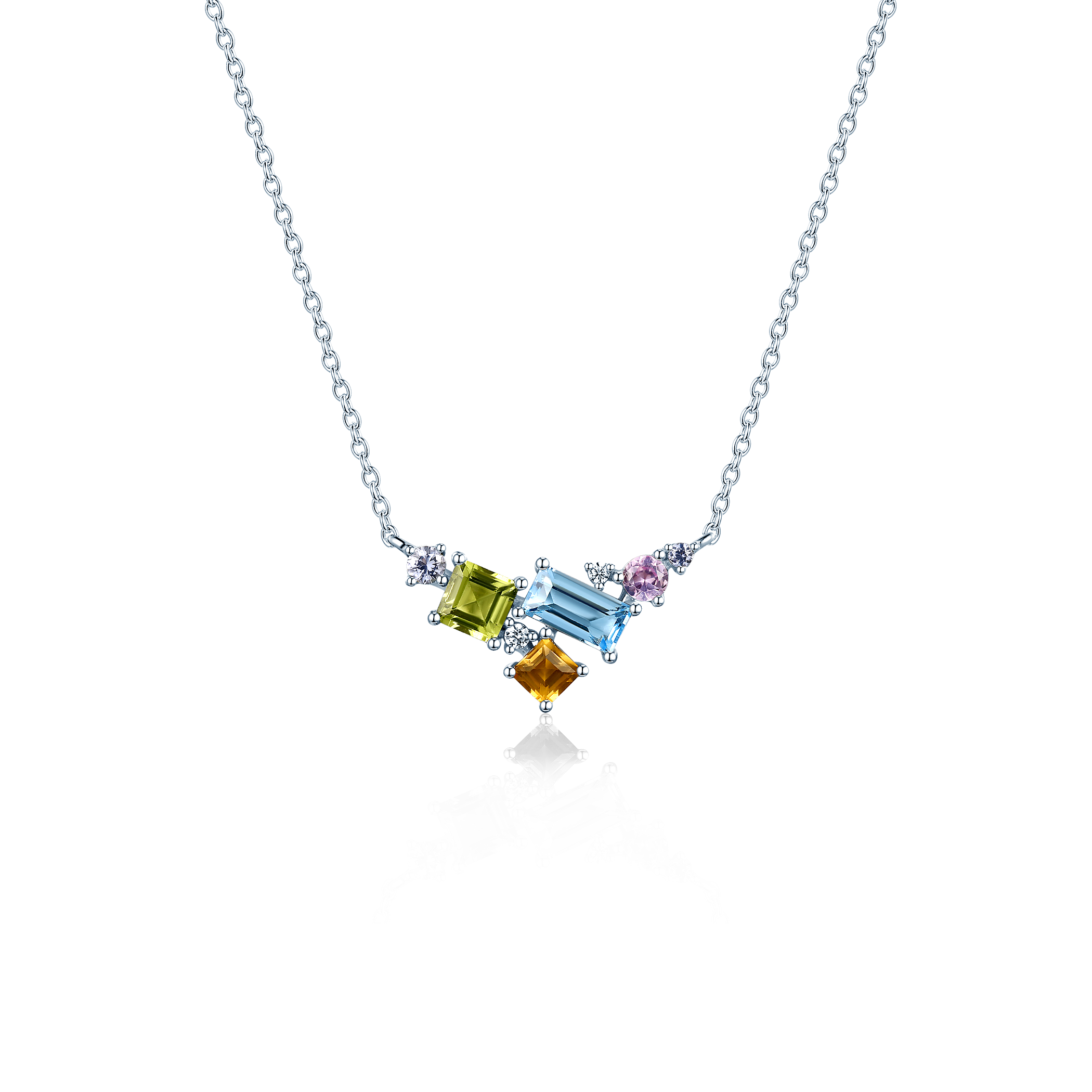 Naszyjnik celebrytka Savicki wykonany ze srebra (próba 925). W naszyjniku osadzony został niebieski topaz o masie 0,5 ct, perydot o masie 0,35ct, niebieskie i białe cyrkonie oraz cytryn o masie 0,16ct.
