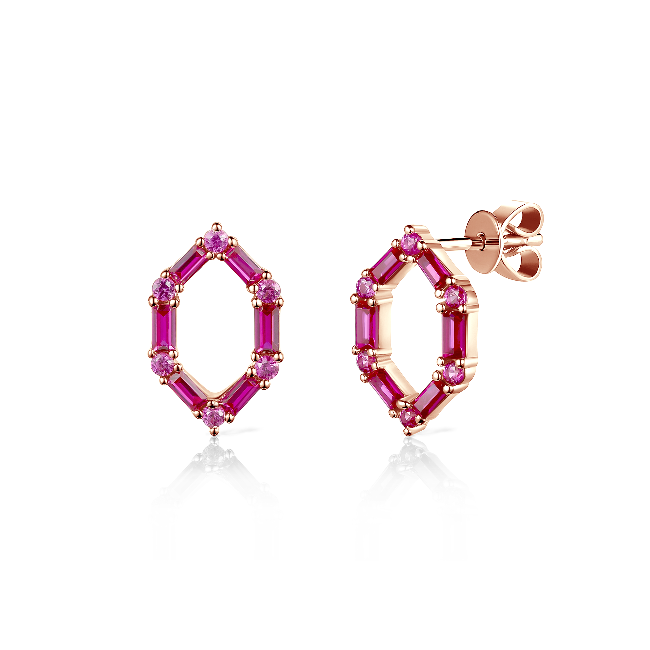 Kolczyki wykonane ze srebra (pr.925) pozłacane różowym złotem. W kolczykach zostały osadzone 24 cyrkonie w kolorze czerwonym.