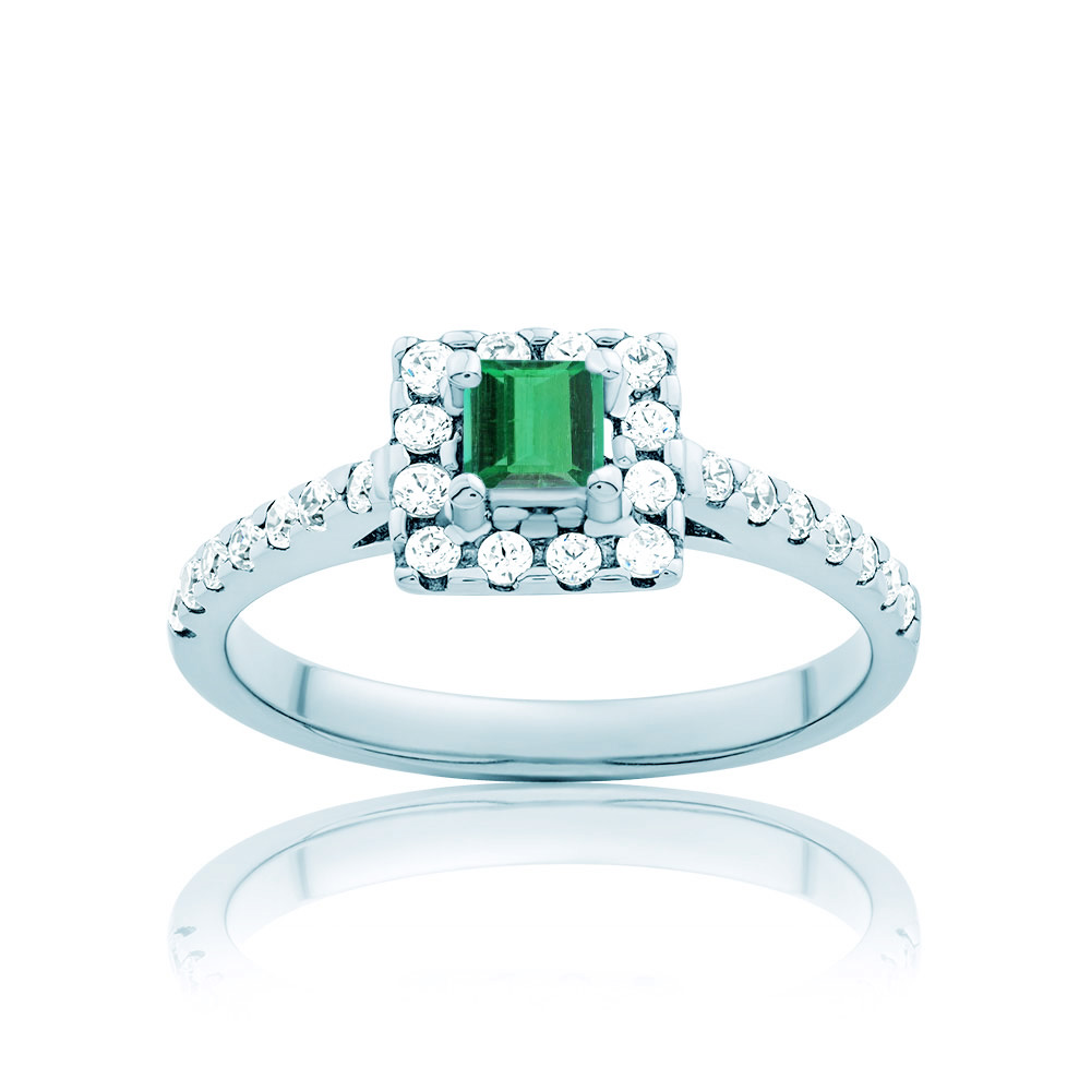 Pierścionek ze szmaragdem o masie 0,30 ct i 26 diamentami o szlifie brylantowym wysokiej czystości SI/H, o łącznej masie 0,31 ct (26x0,012 ct). Wykonany z 14-karatowego białego złota (próba 0,585).