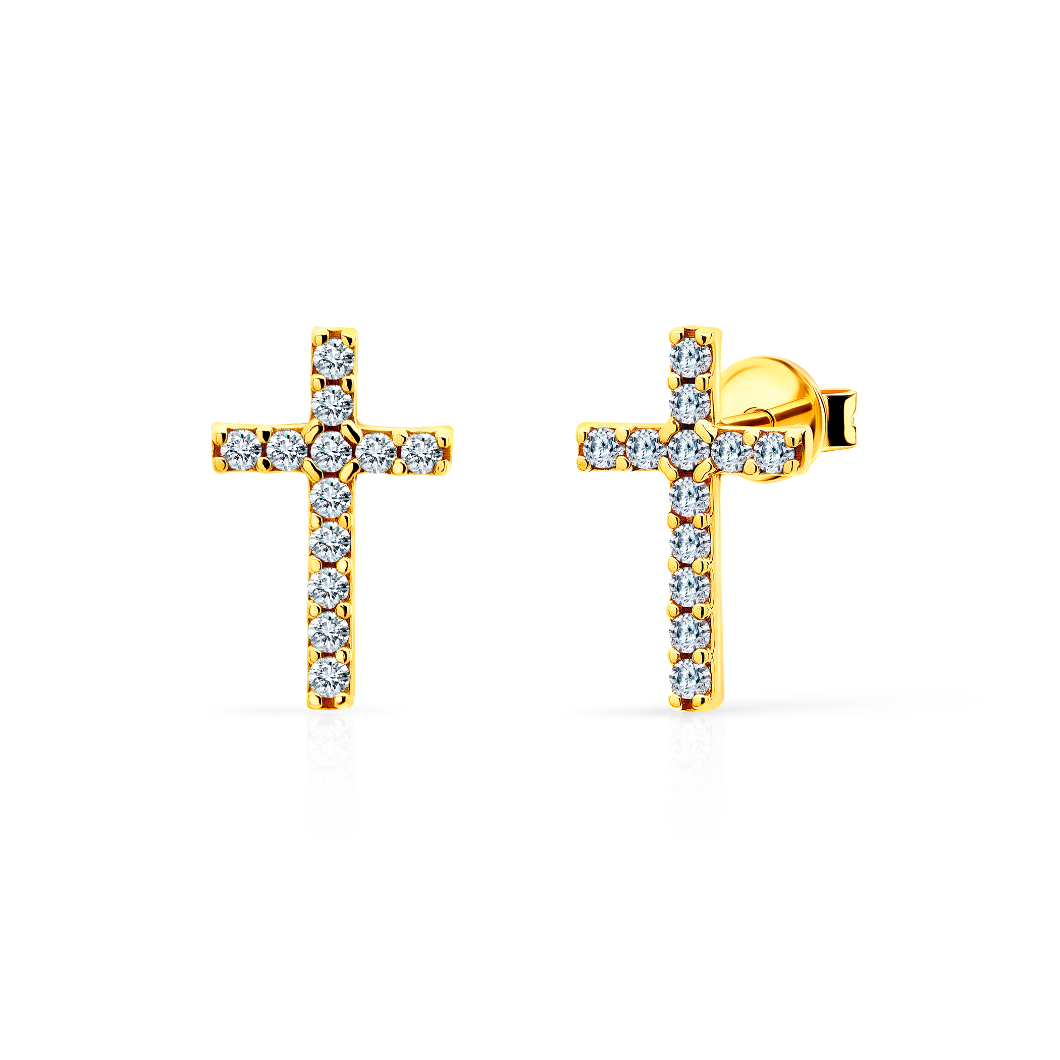 Kolczyki krzyże Savicki wykonane z żółtego złota (próba 585). W kolczykach zostały osadzone cyrkonie.