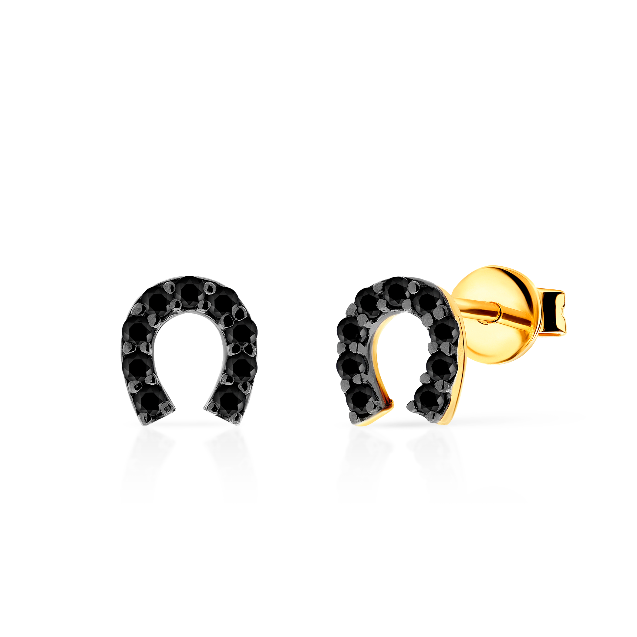 Kolczyki Savicki w kształcie podkowy wykonane z żółtego złota (próba 585). W kolczykach zostały osadzone czarne cyrkonie.