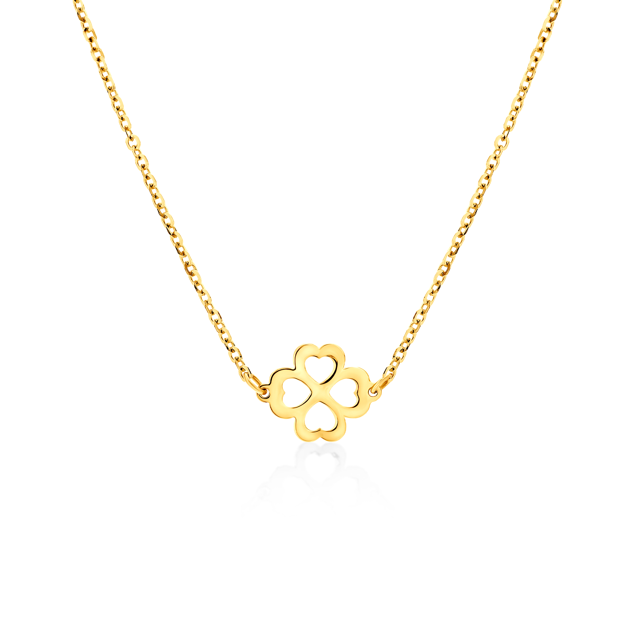 Naszyjnik koniczyna wykonany z żółtego złota (próba 585). Długość naszyjnika: 43cm.