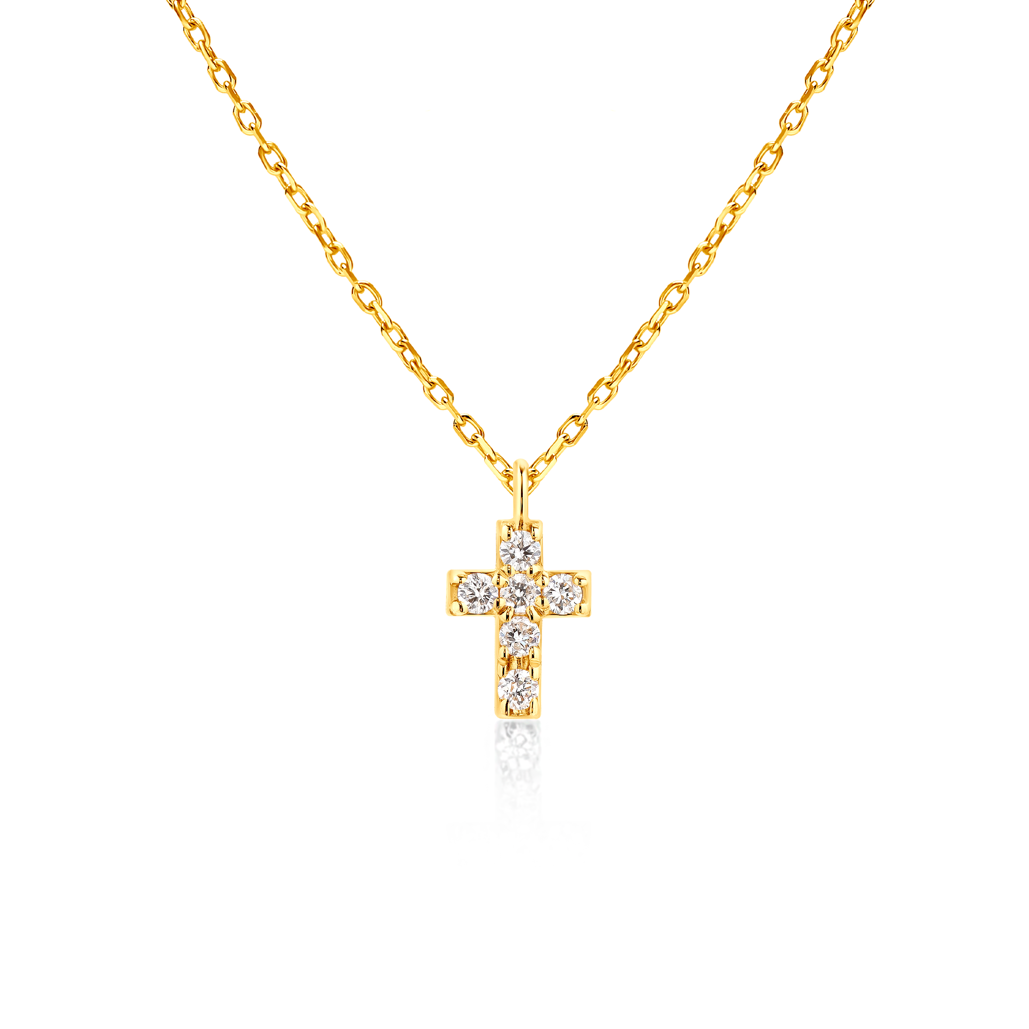 Naszyjnik z krzyżykiem wykonany z żółtego złota (próba 585). W naszyjniku zostało osadzonych 6 diamentów o łącznej masie 0,05 ct.