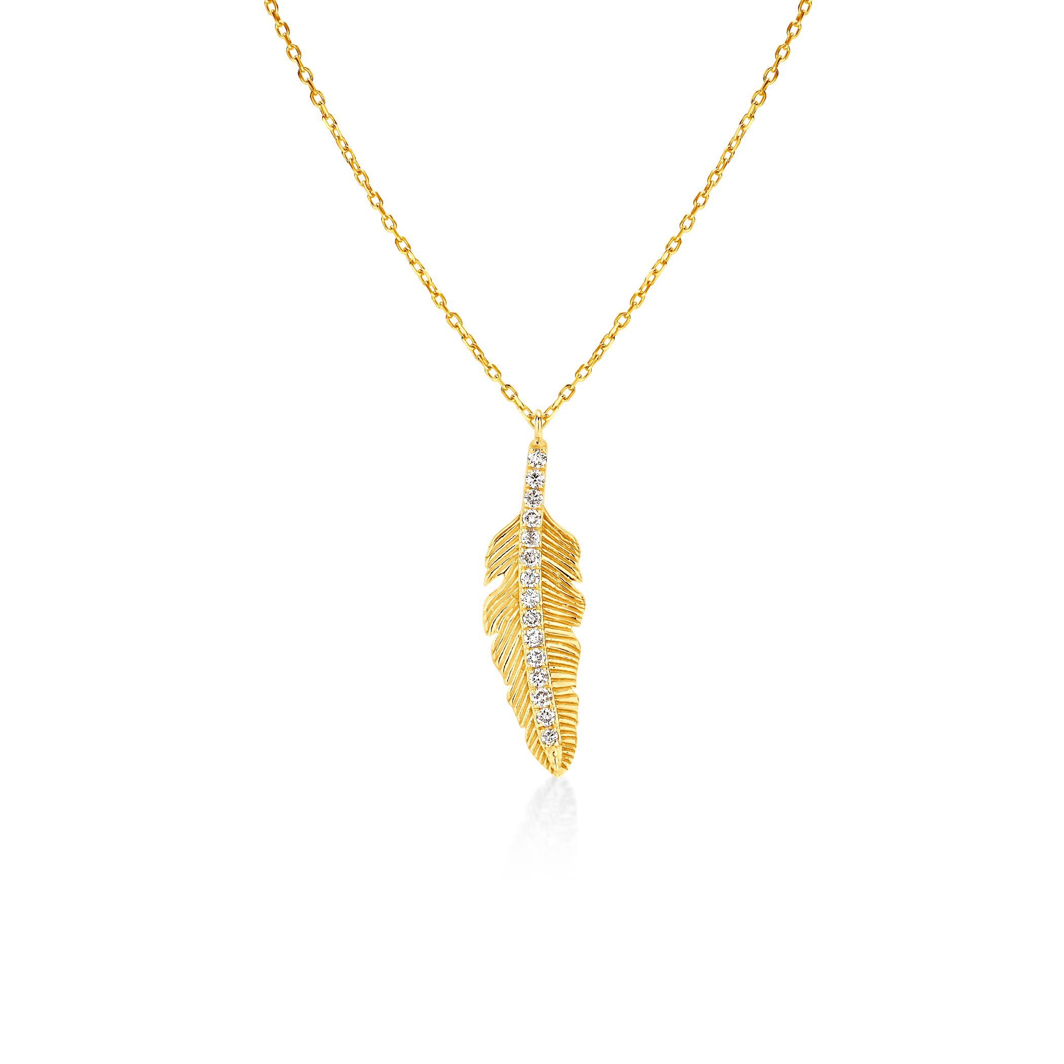 Naszyjnik piórko wykonany z żółtego złota (próba 585). W naszyjniku zostało osadzonych 15 diamentów o łącznej masie 0,13 ct.