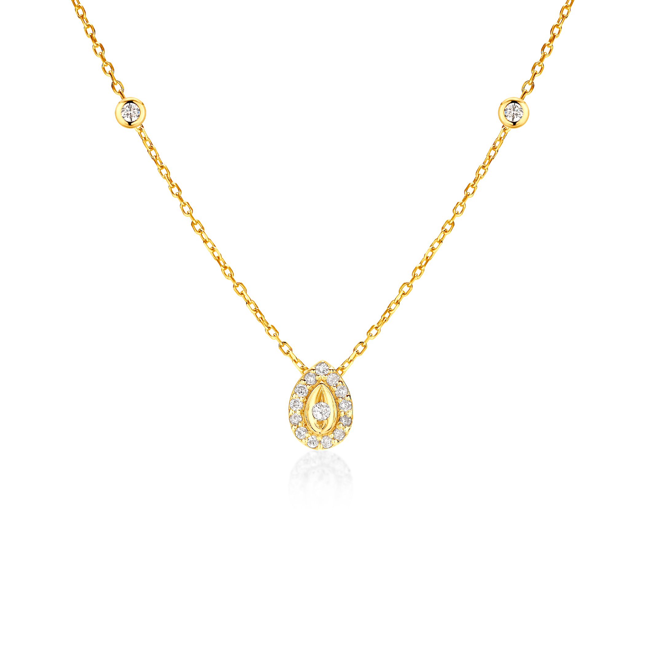 Naszyjnik łezka wykonany z żółtego złota (próba 585). W naszyjniku zostało osadzonych 20 diamentów o łącznej masie 0,16 ct.