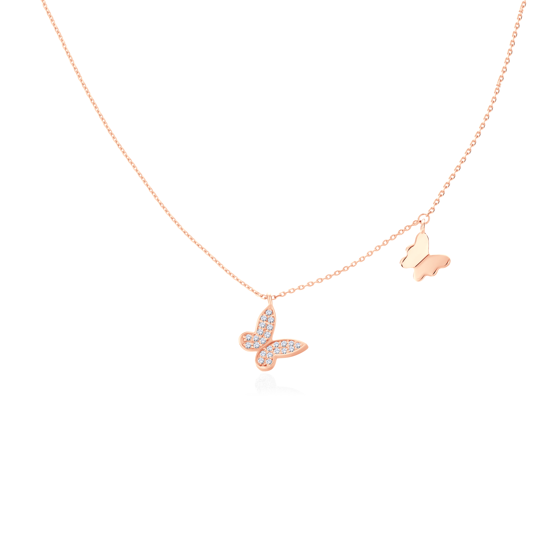 Naszyjnik motylki Savicki wykonany z różowego złota (próba 585). W naszyjniku zostały osadzone diamenty o szlifie brylantowym i łącznej masie 0,069 ct. Długość łańcuszka: 42cm.